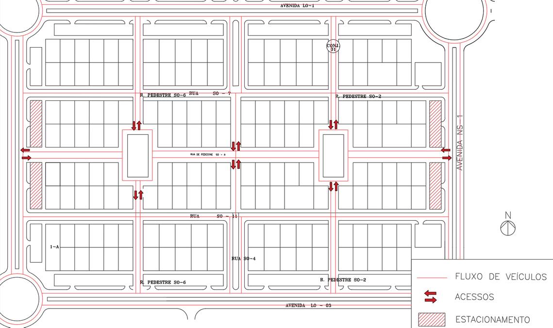 →Apartirdodirecionamentoinicialvoltado paraopedestre,tem-sequearuaSO09,de juntocomaSO02e06,aprimeiranosentido leste-oeste,asduasúltimasnosentidonorte sul,mesmosendoagoraviaslivrespreservam aindaumacertaproximidadeaopedestre.