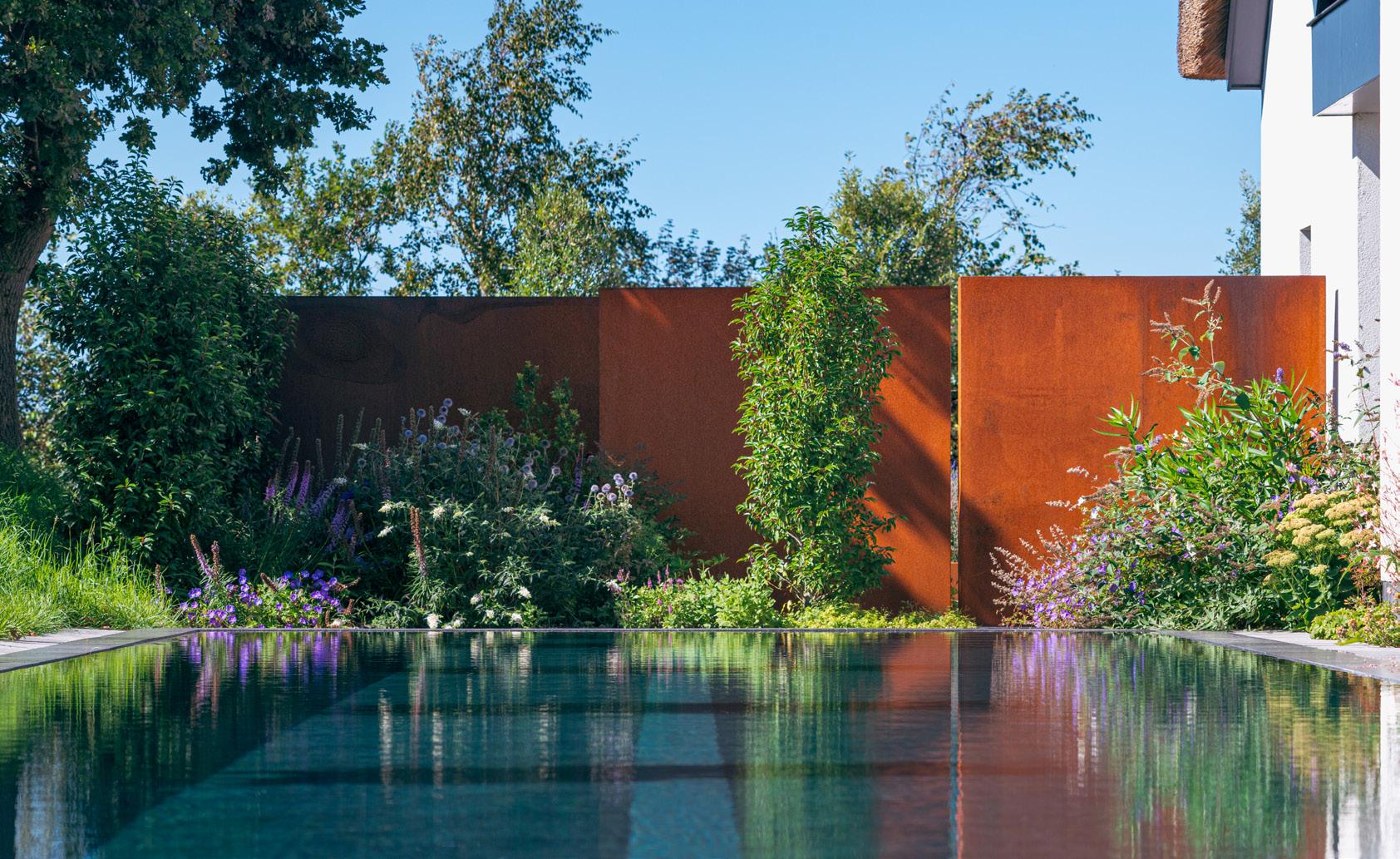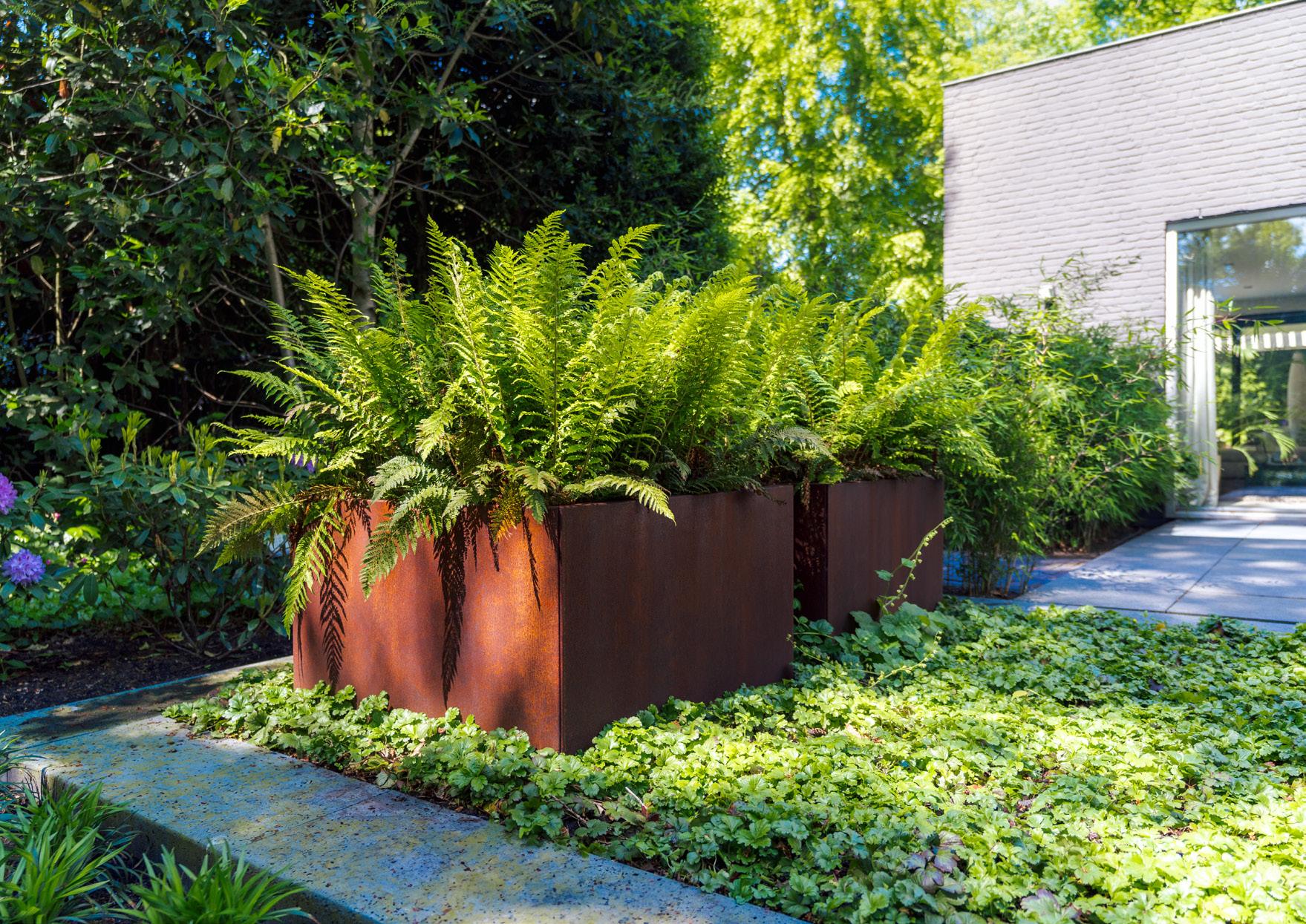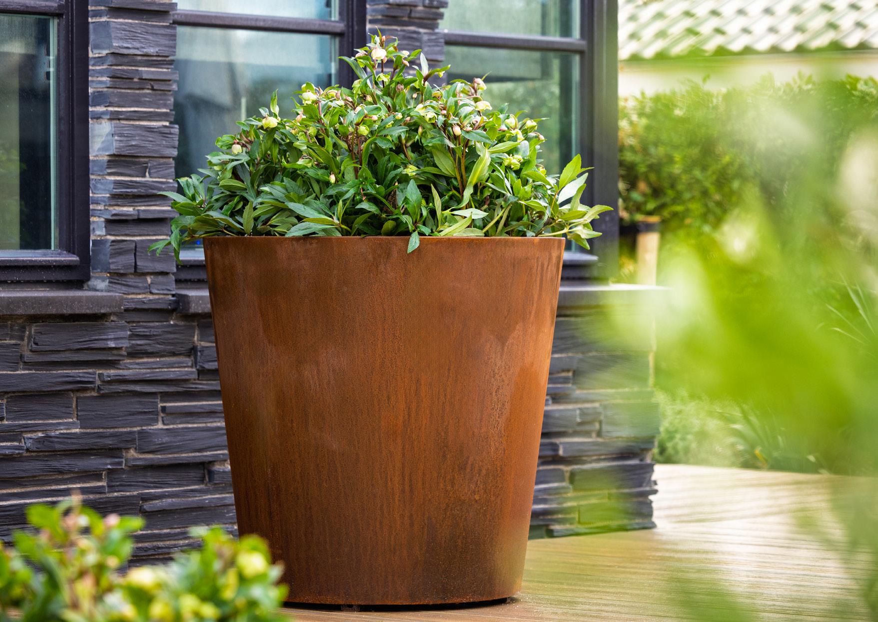 Ta donica z prostymi narożnikami pasuje do ogrodów o prostych liniach. Czysta, podwójna obręcz nadaje jej więcej ciała.