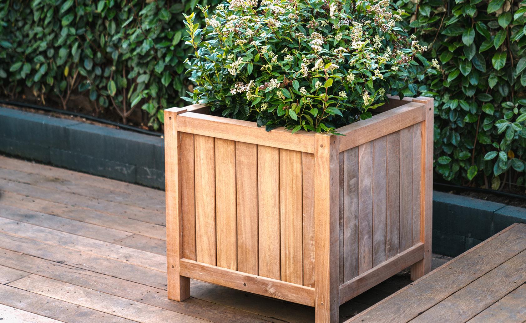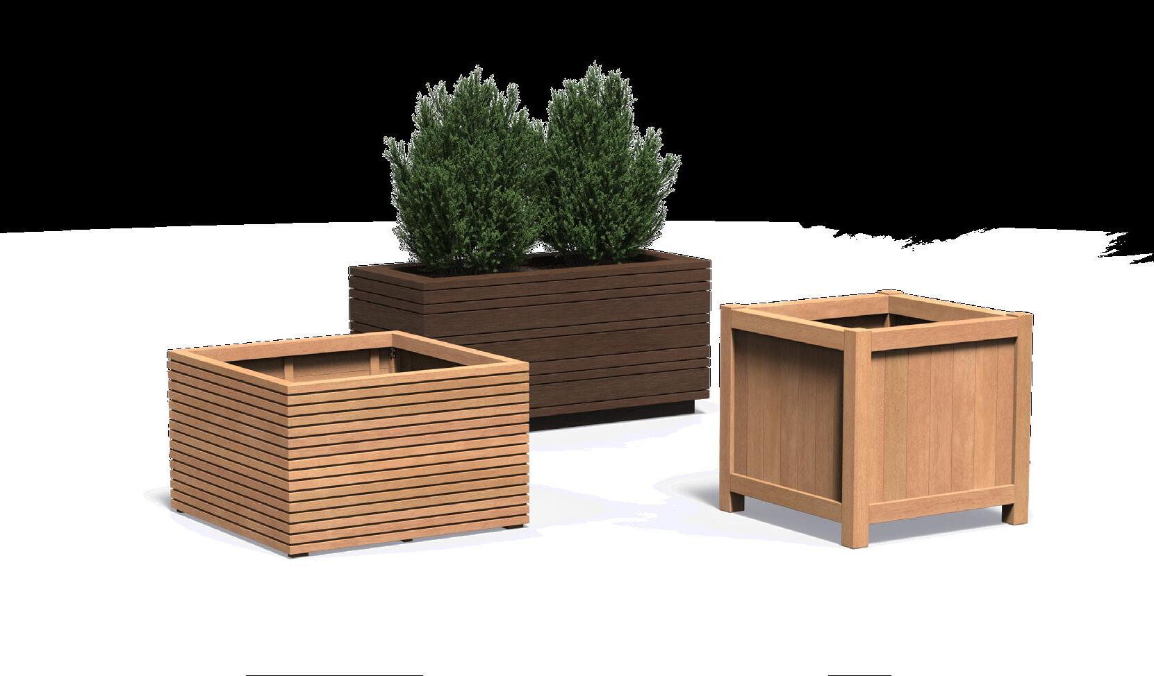Drewniane donice wprowadzają naturalną atmosferę do ogrodu. Wykonane z egzotycznego