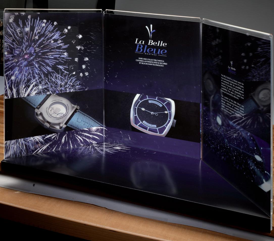 En hommage aux arts pyrotechniques, la montre ”La Belle Bleue” symbolise la partition entre le son et la lumière (au 100ème de seconde). Comme dans un orchestre, c’est le reflet des émotions souhaitées par le maître artificier Gérard Bocage. Élaborée et réalisée à Besançon (capitale de l’horlogerie française), son cadran en aventurine de Murano, est un clin d’œil aux artificiers et son bracelet est en cuir de veau français.
