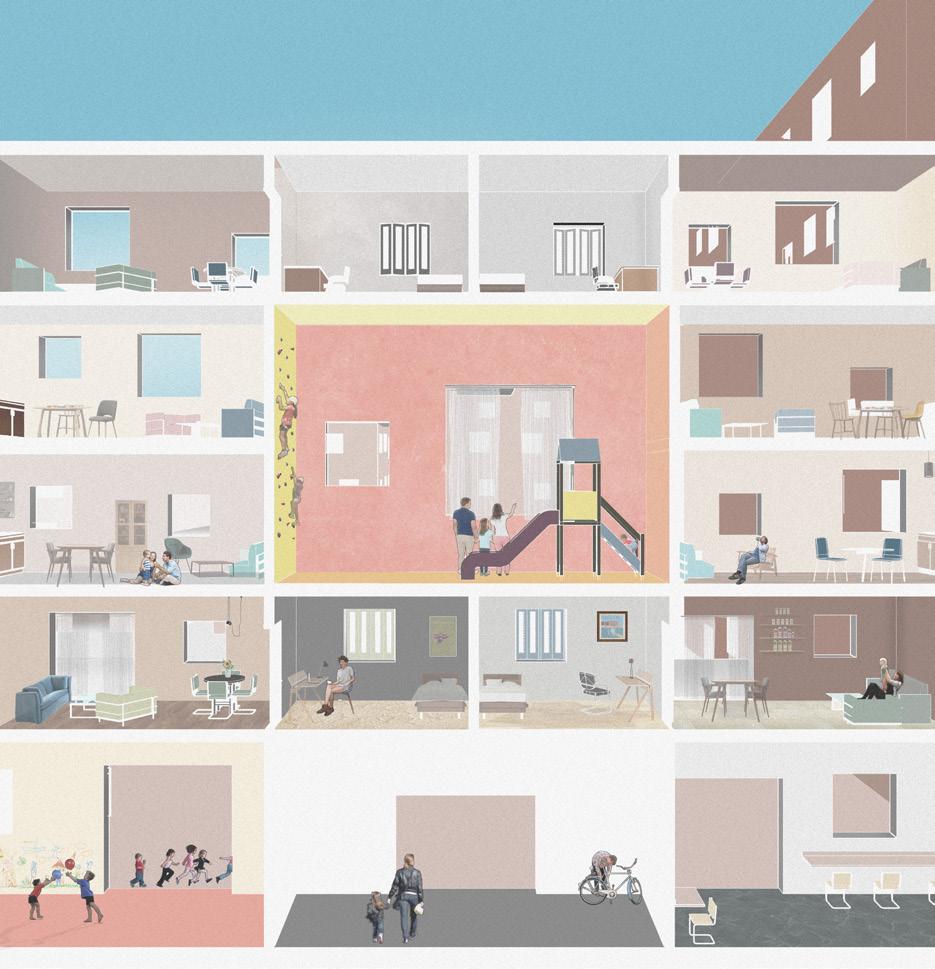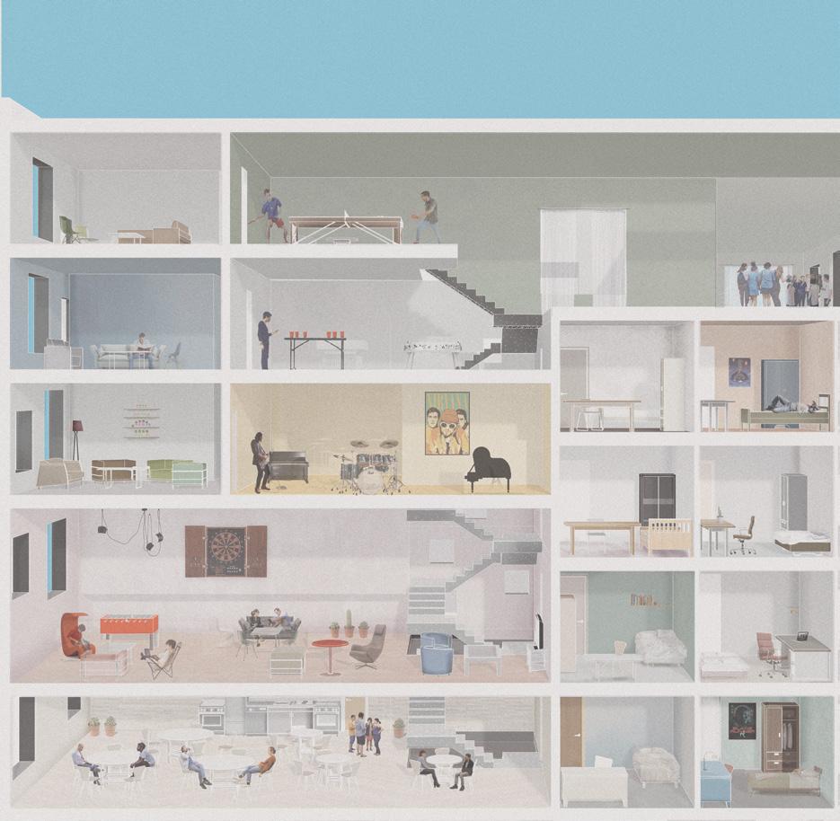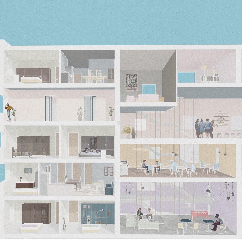 THE AIM OF THIS CO-LIVING COMPLEX IS TO COMBAT THE GENTRIFICATION WHICH WILL TAKE PLACE IN AFFORDABLE HOUSING AND SHARING BETWEEN DIFFERENT CATEGORIES AND DIFFERENT CULTURES OF PEOPLE. QUALITY OF LIVING FOR DIFFERENT CATEGORIES: SINGLES ‘WG’ HOUSING, MIXED HOUSING, SOCIAL HOUSING