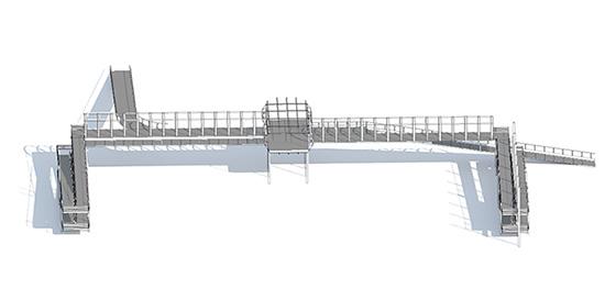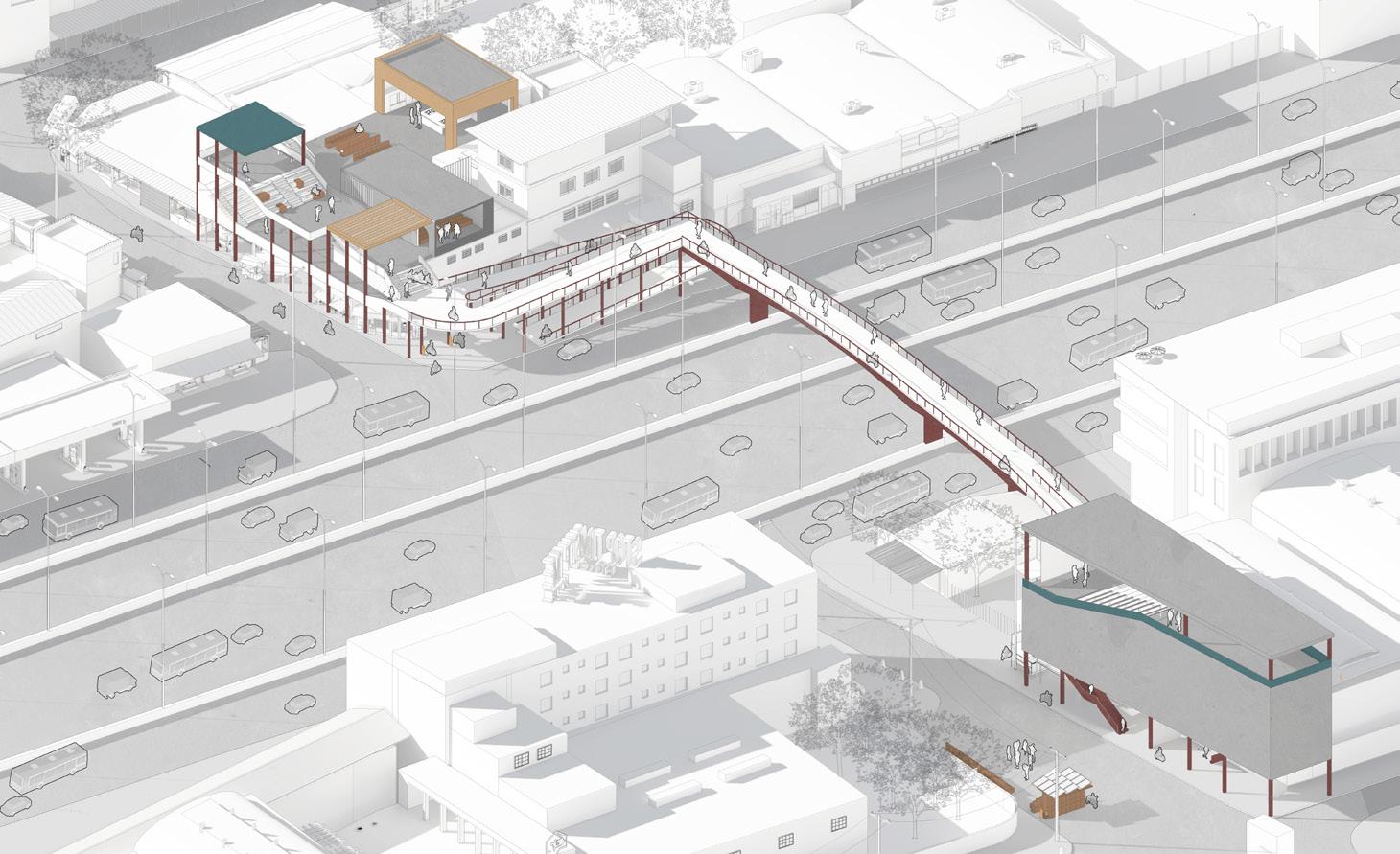 The Motostop (1) is directly connected to the redesigned pedestrian bridge (2) which facilitate the crossing of the Mototaxis to the other side.