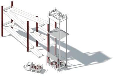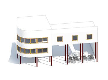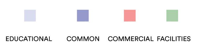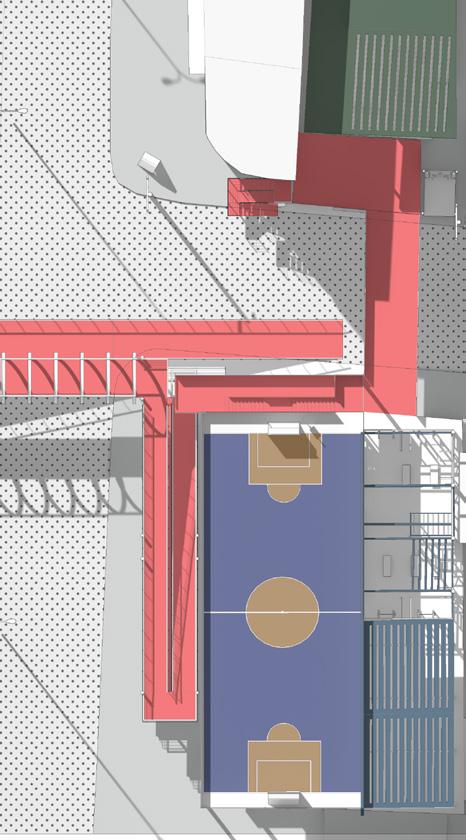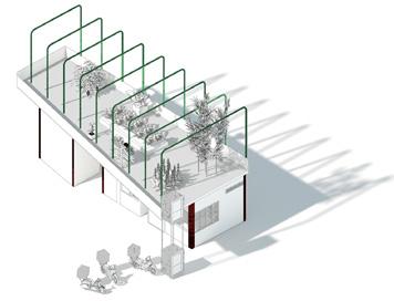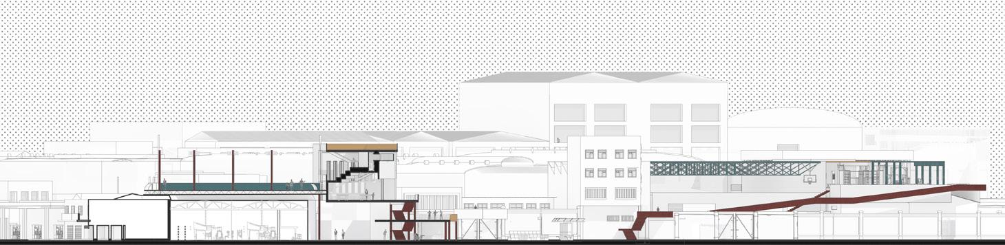 1. Motostop 2. Pedestrian/ Mototaxi bridge 3.Charging Pods 1. Communal kitchen 2.Pedestrian/ Mototaxi bridge 3.Classroom 4. CinemaThe vacant factories’ rooftops morphs into the new Sports complex which consists of ind oor sports rooms (3)and a Swimming pool (4) at the First level. Ground level