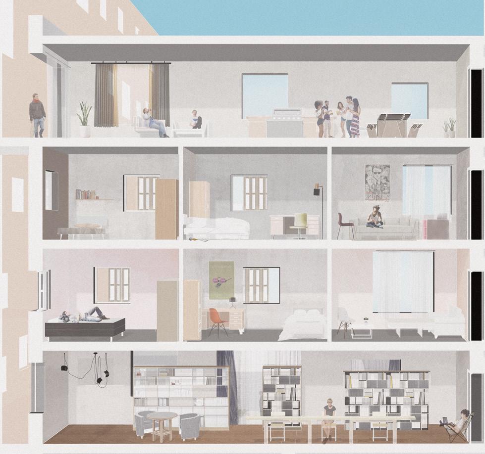 The mixed building offers different communal spaces such as the communal kitchen as well as different bedrooms and apartments sizes for different users.
