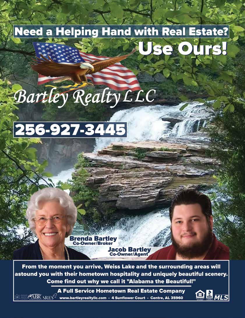 Alabama Mountain Lakes Association ......... 39 Alabama ONE 49 American Auctioneers ................................. 45 Atrium Health Floyd ................................... 25 Bartley Realty, LLC Inside Back Cover Bay Springs Country Inn, Marina and Campground ........................................ 57 Cherokee County Commission 29 Cherokee County IDA ................................ 75 Cherokee County Public Library 73 Cherokee County Sheriff Jeff Shaver 41 Cherokee Electric Co-op ............................. 73 Cherokee Pines Golf Club 3 Cherokee Rock Village 39 City of Centre ............................................. 67 Country Financial 77 Curley’s Cove Back Cover DC Gas ....................................................... 35 F&M Bank 47 Family Care Center 59 Gadsden State Community College............. 33 GO Realty 62 Lakefront Living.......................................... 42 LakeWeissAlabama.com .............................. 23 Northeast Orthopedic Sports, Spine & Physical Therapy ......................................... 71 Orbix Hot Glass .......................................... 59 Peoples Bank 61 Perry Medical Clinic.................................... 71 Piggly Wiggly .............................................. 63 Pirates Bay Waterpark 79 Regions Bank .............................................. 37 RL Jennings & Associates ............................ 37 State Representative Ginny Shaver 59 Stone Chapel at Riverside ............................ 51 Theatre Centre 61 Town of Cedar Bluff, Liberty Day 65 Town of Leesburg ........................................ 69 Weiss Lake Realty Inside Front Cover WLIA 63 Yellow Creek Villa Estates............................ 41