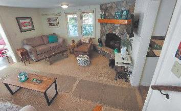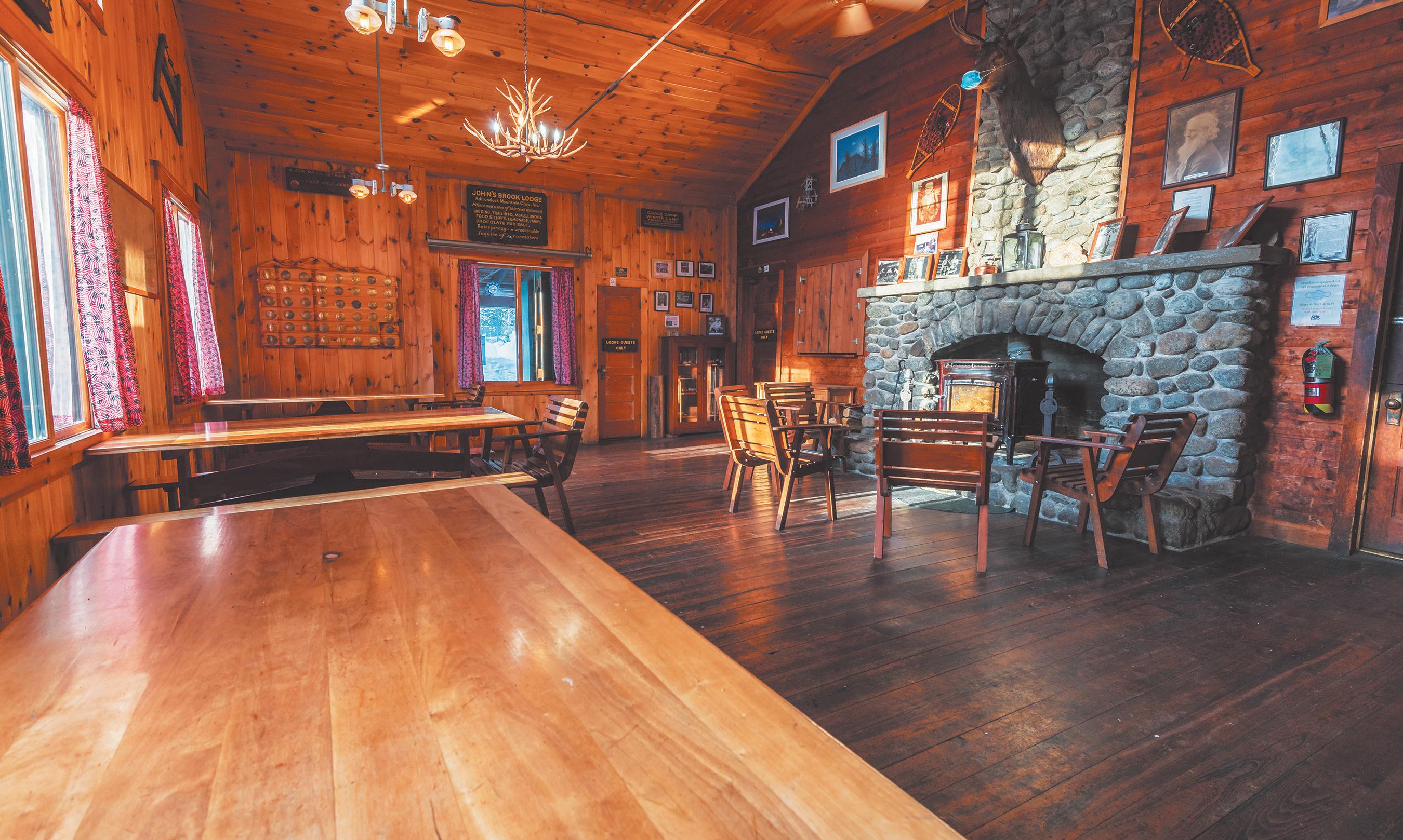The Johns Brook Lodge’s great room features a fireplace and dining area. (Provided photo — Adirondack Mountain Club)