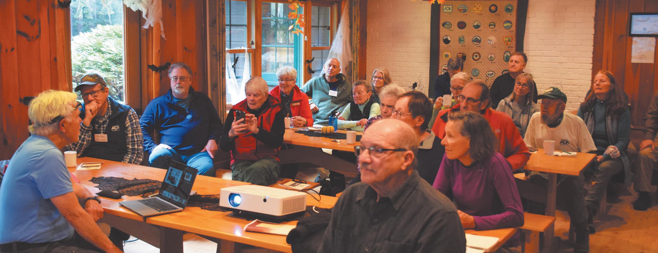 A crowd gathers at the Adirondak Loj on Oct. 25 to celebrate the Johns Brook Lodge’s centennial and listen to a presentation on its history given by Tony Goodwin, left. (Enterprise photo — Chris Gaige)
