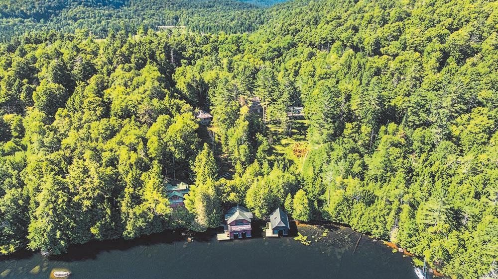 Upper Saranac Lake: Panther Cove is a rare 16.5 acre estate with 482 ft. of shoreline. A generational retreat including a main residence, historic farmhouse, Adirondack cabin, whimsical Japanese teahouse, 2 boathouses, 2 garages. $4,200,000