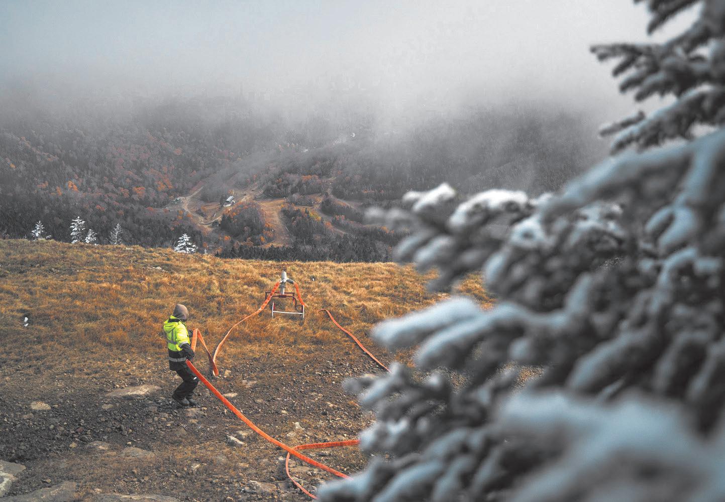 A member of the Whiteface Mountain ski center’s snowmaking crew adjusts a line to a mobile snow gun on the Upper Skyward trail near the mountain’s summit area on Oct. 27.