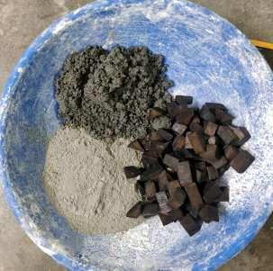 Coarse blow torched wood chips - 2.5 Lime - 0.5 Saw dust - 1 Hemp - 1 Water - 0.4