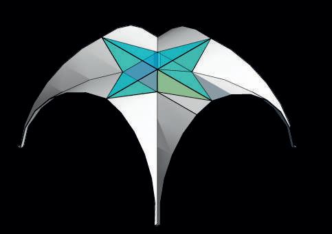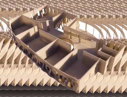 SPINWHEEL FORM WITH SLEEK GEOMETRY CREATING TRANSITION OF EACH SPACE OPENING INTO LANDSCAPE