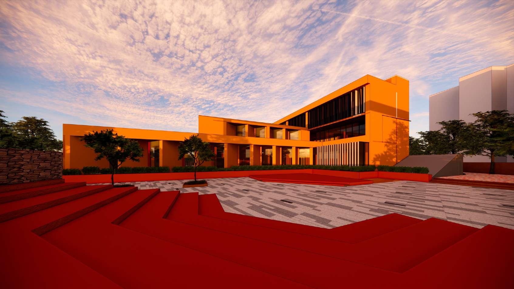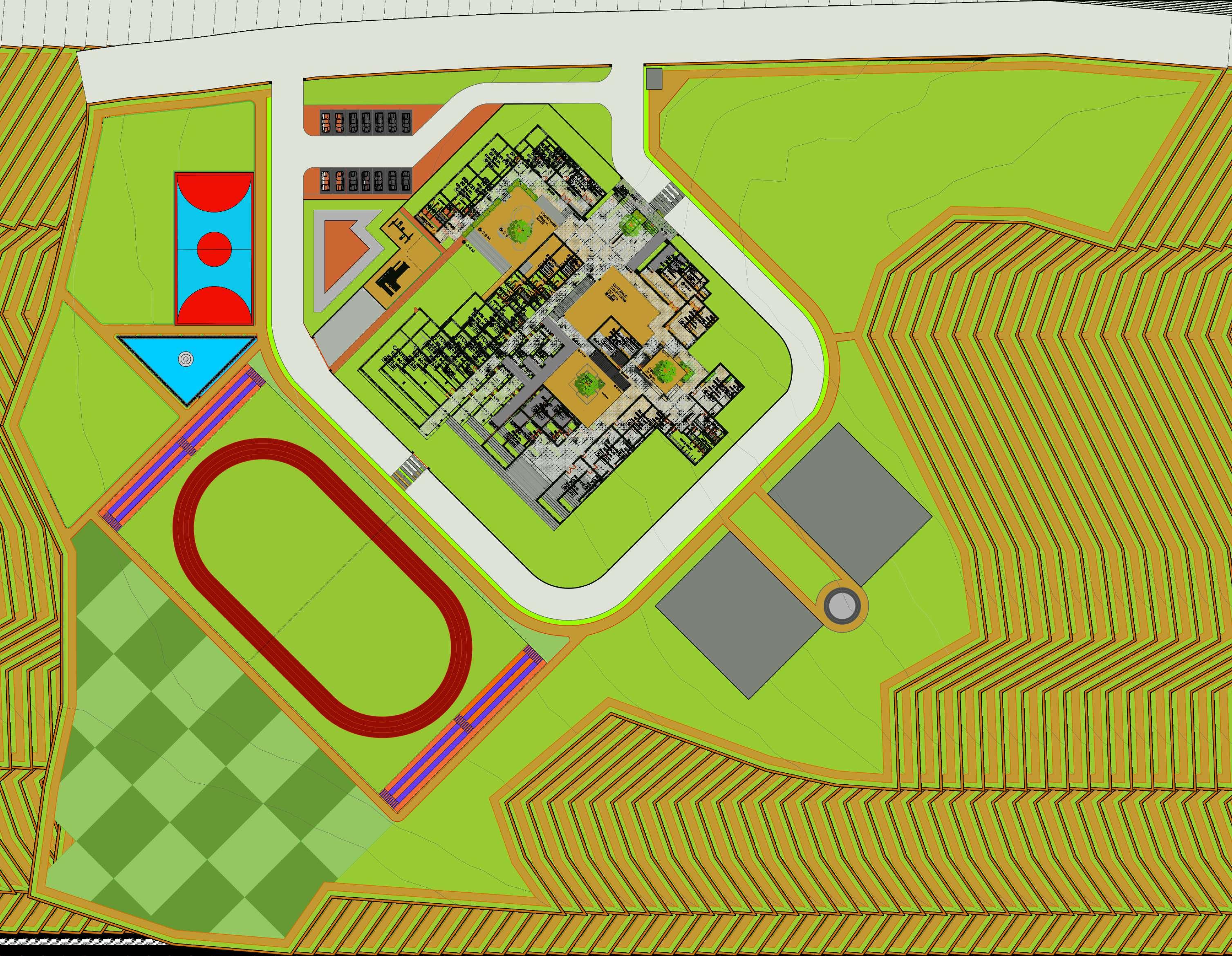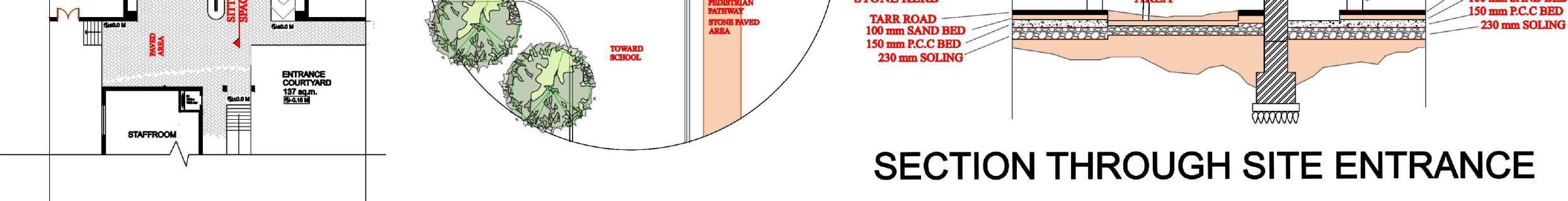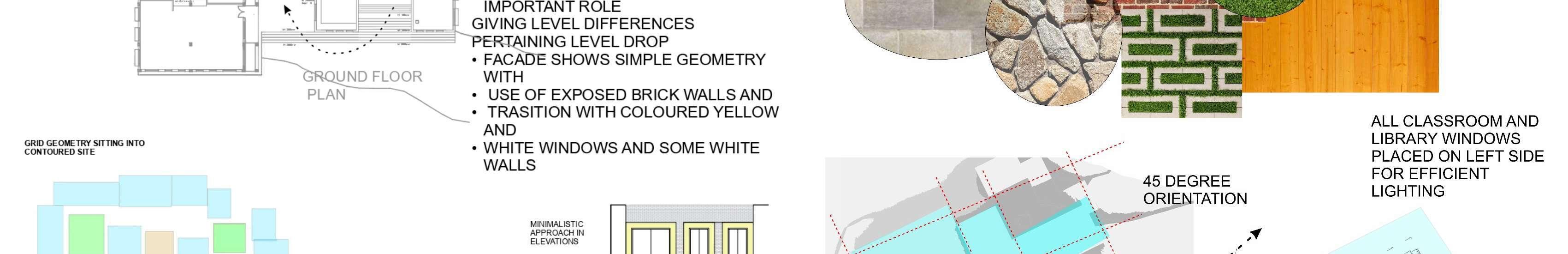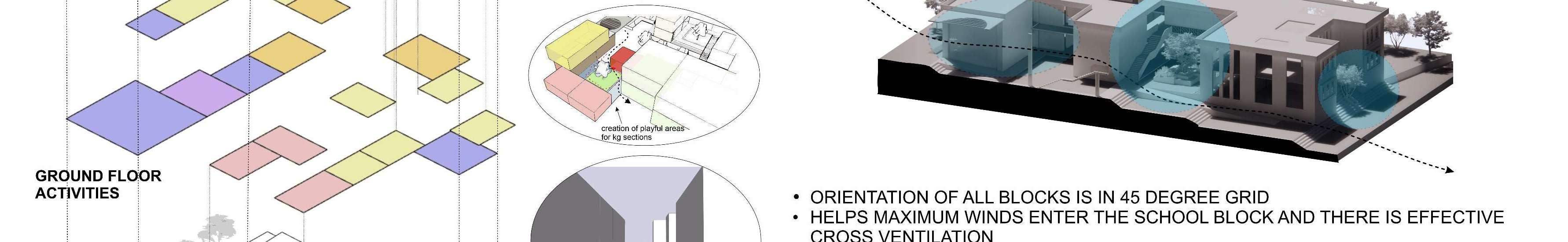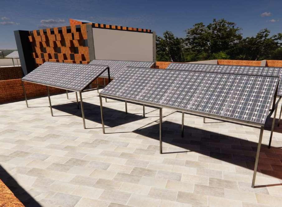 DESIGN POSSES SLOPING ROOF RESPONDING TO CLIMATE ROOF HAS LIGHT WELL PLACED AT CENTRE FACING SOUTH SIDE TO BRING IN DIFUESD LIGHT IN AFTERNOON SOLAR PANELS ARE PLACED ON FLAT PROFILE SLABS FACING SOUTH ,WITH AIM TO USE SOLAR ENERGY FOR ELECTRICITY PURPOSE AND SOLAR WATER HEATER PROVIDES HOT WATER TO KITCHEN AND CANTEEN AREAS.