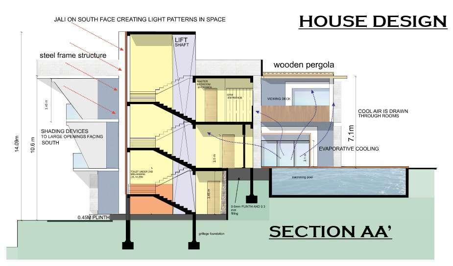 EVAPORATIVE COOLING CAN BE DONE THROUGH WALL POROUS MATERIAL INSIDE THE WALL FILLED WITH WATER SUPPLY FROM STORED RAINWATER WALLS FACING SOUTH AND SOME ON WEST CAN BE USED