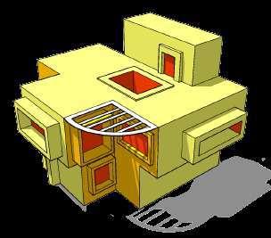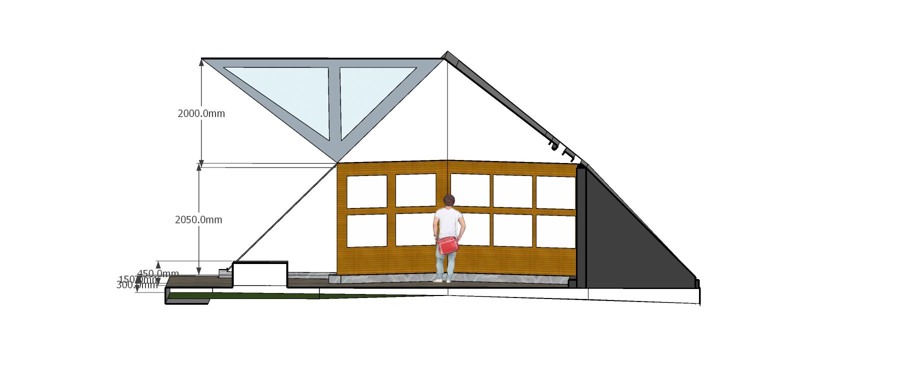 WALLS WITH INBUILD SHELVING AREA ROTATED AT AN ANGLE TO BRING IN NORTH LIGHT AND BLOCK THE HARSH RADITAION ON SOUTH AND WEST