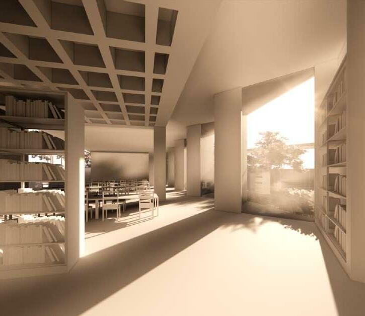 LIBRARY FACING NORTH AND NORTH EAST WITH DIFFUSED LIGHT IN MORNING