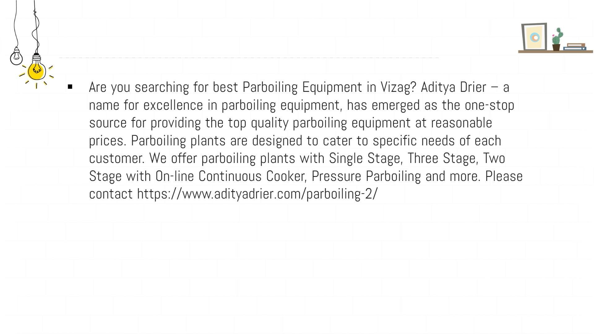 Are you searching for best Parboiling Equipment in Vizag? Aditya Drier – a name for excellence in parboiling equipment, has emerged as the one-stop source for providing the top quality parboiling equipment at reasonable prices. Parboiling plants are designed to cater to specific needs of each customer. We offer parboiling plants with Single Stage, Three Stage, Two Stage with On-line Continuous Cooker, Pressure Parboiling and more. Please contact https://www.adityadrier.com/parboiling-2/