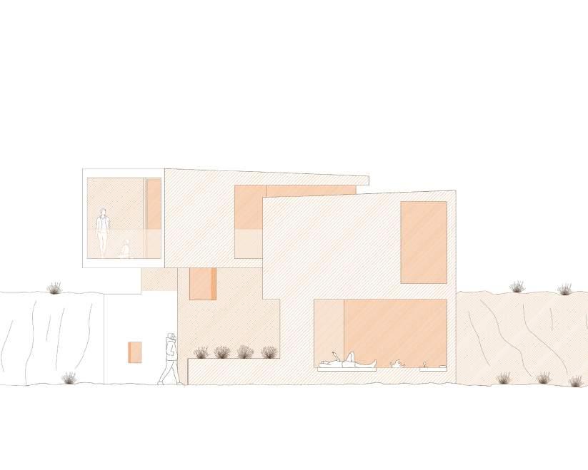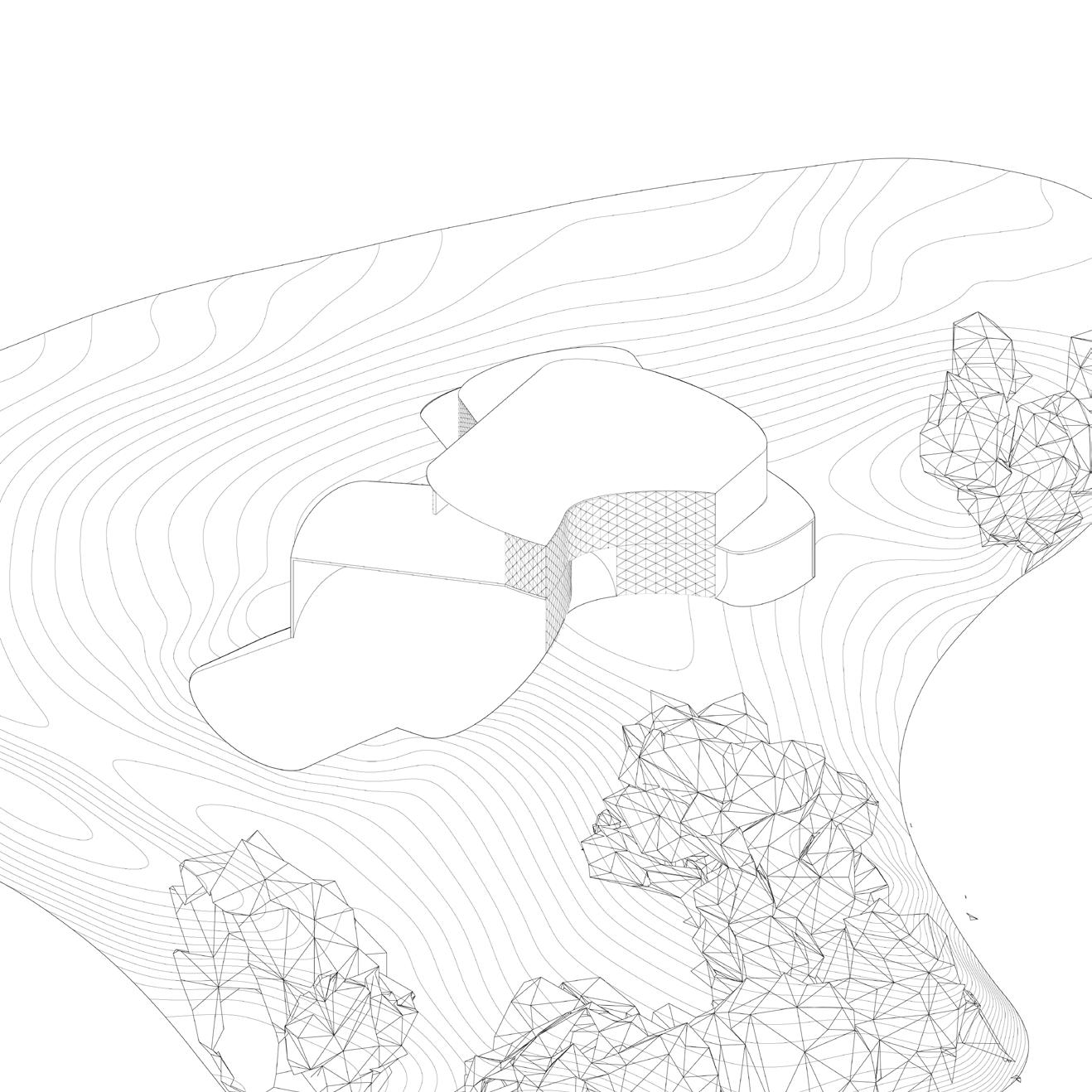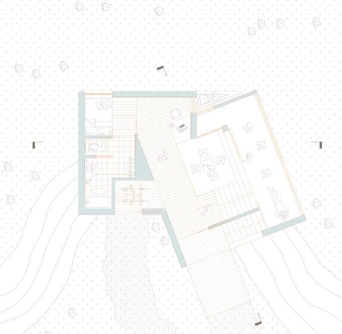 The Desert House explores the spatial relationship beginning from a simple movement of overlapping two squares. The squares are patterned based on the topographical lines of the site in order to create the initial figure ground. The lines shapes the connection and separation between programs, creating a clear pathway in both indoor and semi-outdoor spaces. The tatami table inside the house extends itself outside of the house, serving as balcony and a roof to the stairs leading to Ground Floor.