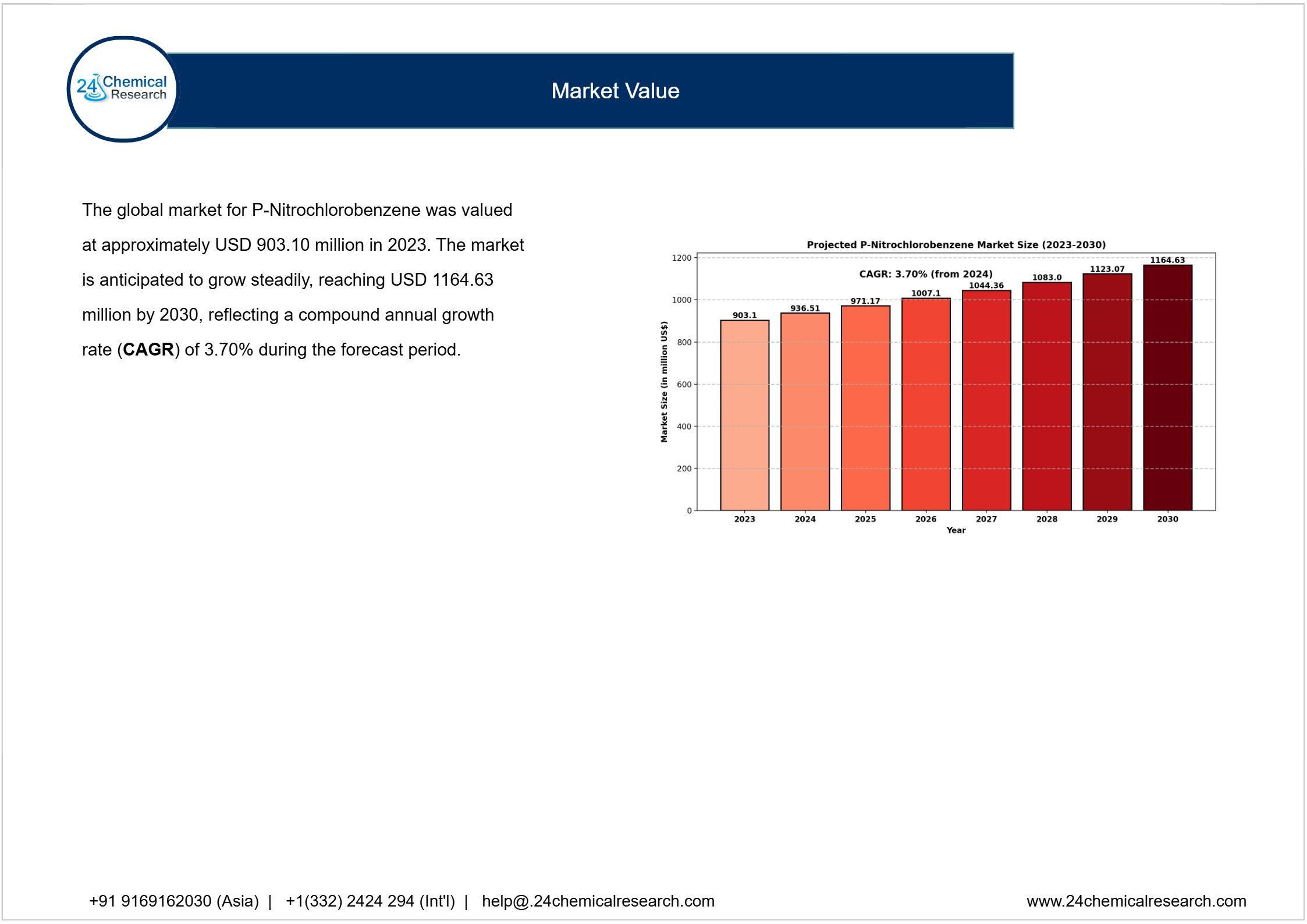 The global market for P-Nitrochlorobenzene was valued at approximately USD 903.10 million in 2023. The market is anticipated to grow steadily, reaching USD 1164.63 million by 2030, reflecting a compound annual growth rate (CAGR) of 3.70% during the forecast period.