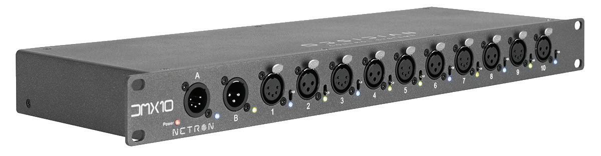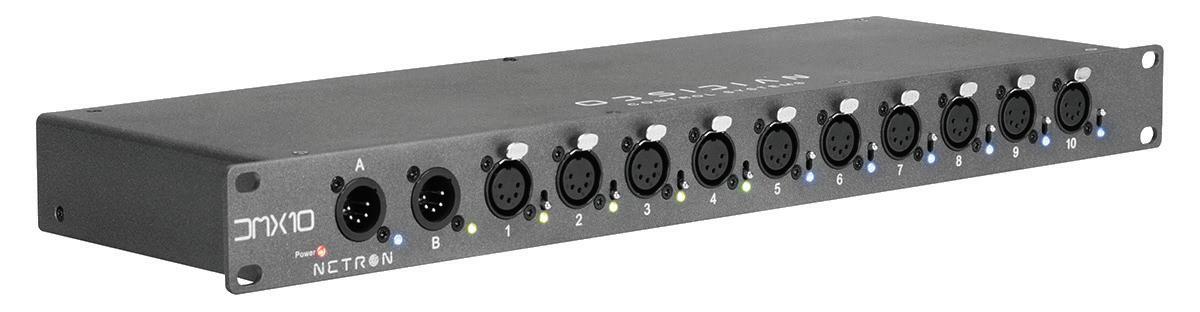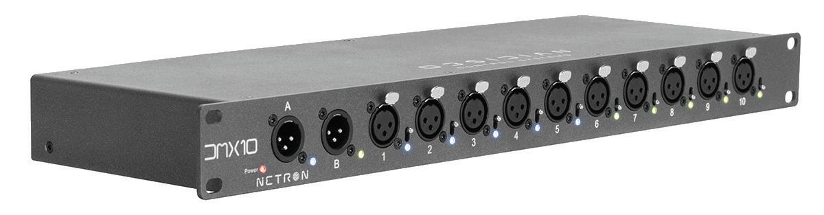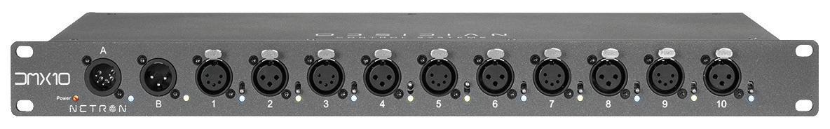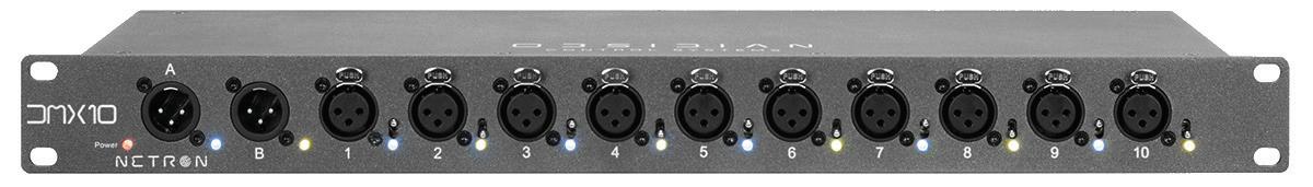The NETRON DMX10-53 is a rackmount 10-port DMX Splitter with dual inputs and freely assignable 5 and 3pin XLR DMX outputs. Utilizing long life toggle switches every port is routed to either the A or B input, providing flexibility to accommodate any situation. The DMX10 is made from a rugged metal chassis featuring impact resistant paint and a lightweight yet solid construction.