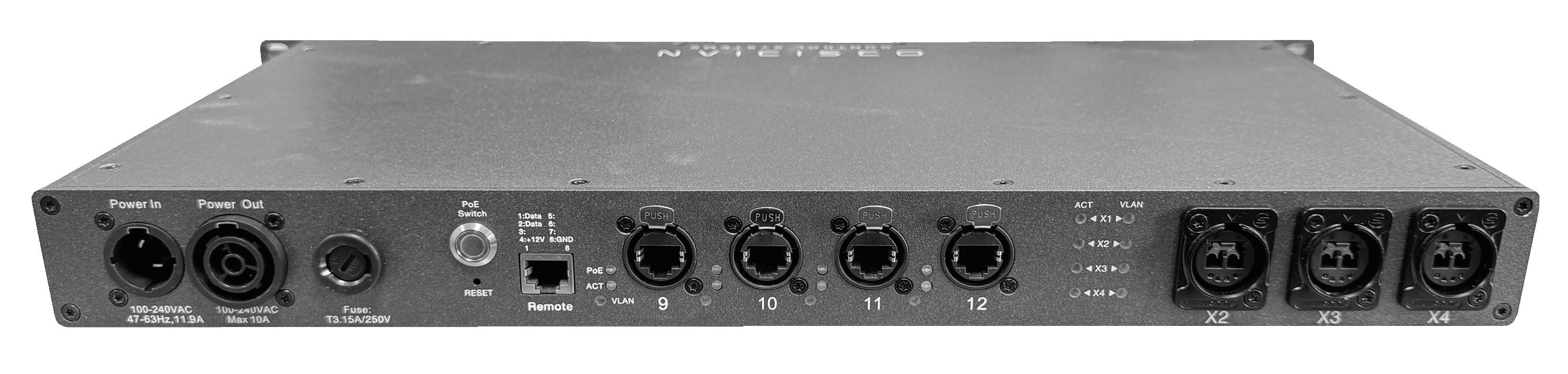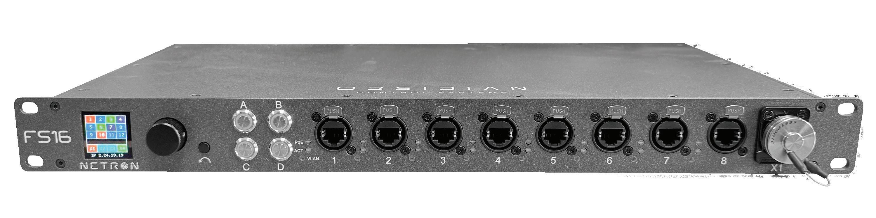 The NETRON FS16 is a powerful rackmount network switch featuring 12 Gigabit ports, 4x Fiber ports (1x 10G in the front and 3x 1.25G in the rear) and PoE+ support. With a total POE power budget of 180W the FS16 is ideally suited to distribute data and power to NETRON nodes or any other PoE+ compatible network appliance. Highly optimized for processing the high data volume found in today’s ever-growing lighting systems, the NETRON FS16 distributes a variety of entertainment protocols without delay, ensuring instant reaction times and flawless execution.