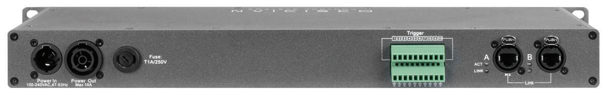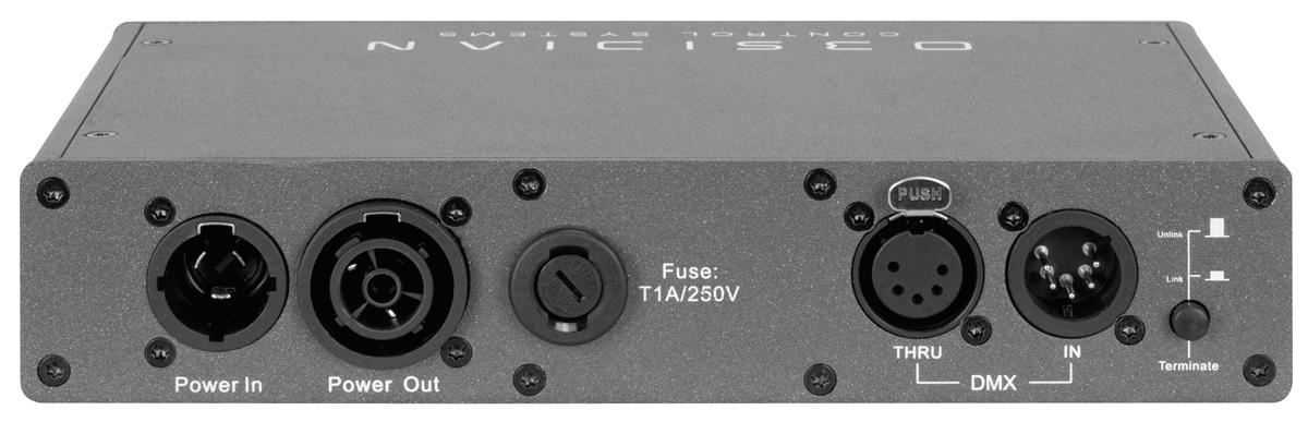 DMX10-5 Front – (2) 5pin DMX Input – (10) 5pin Opto-Isolated DMX Outputs Back – Locking Power In