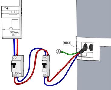 • einem allpoligen Schutzschalter 10 A (Kurve D) oder 16 A (Kurve C) mit einer Öffnung der Kontakte von mindestens 3 mm.