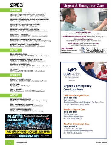 HEALTHCARE REEDSBURG AREA MEDICAL CENTER - REEDSBURG 2000 N Dewey Ave | 608-524-6487 | ramchealth.com SSM HEALTH DEAN MEDICAL GROUP - WISCONSIN DELLS 1310 Broadway | 608-253-1171 | ssmhealth.com SSM HEALTH ST CLARE HOSPITAL - BARABOO 707 14th St | 608-356-1400 | stclare.com SSM HEALTH URGENT CARE - LAKE DELTON 530 Wisconsin Dells Pkwy | 608-254-5959 | ssmhealth.com TRAVEL MART PHARMACY 802 Broadway | 608-253-4231 | travelmart-pharmacy.com WALGREENS PHARMACY - WISCONSIN DELLS 300 State Hwy 13 | 608-254-5760 | walgreens.com/pharmacy WALMART PHARMACY - WISCONSIN DELLS 130 Commerce Street | 608-253-5662 | walmart.com