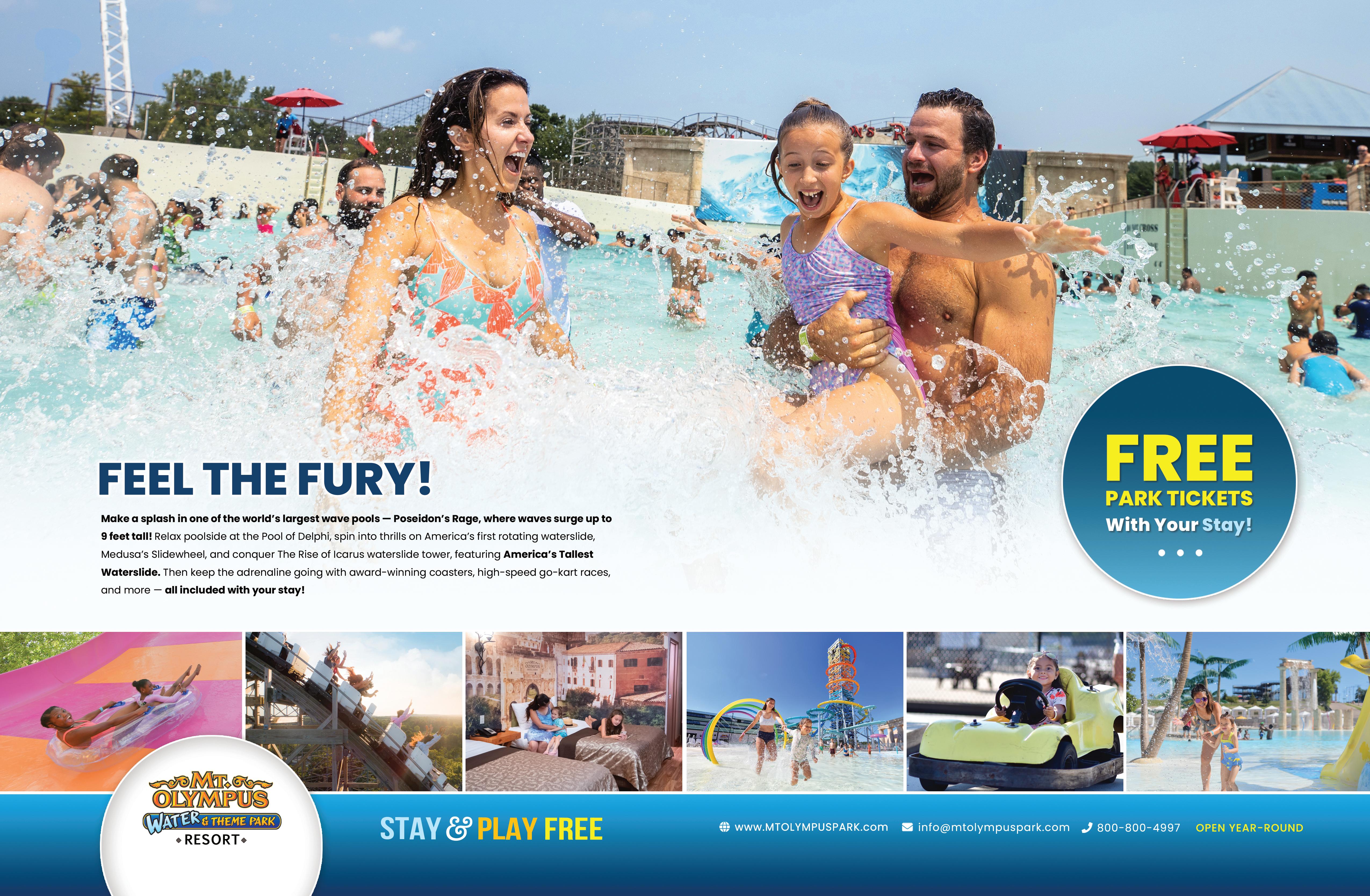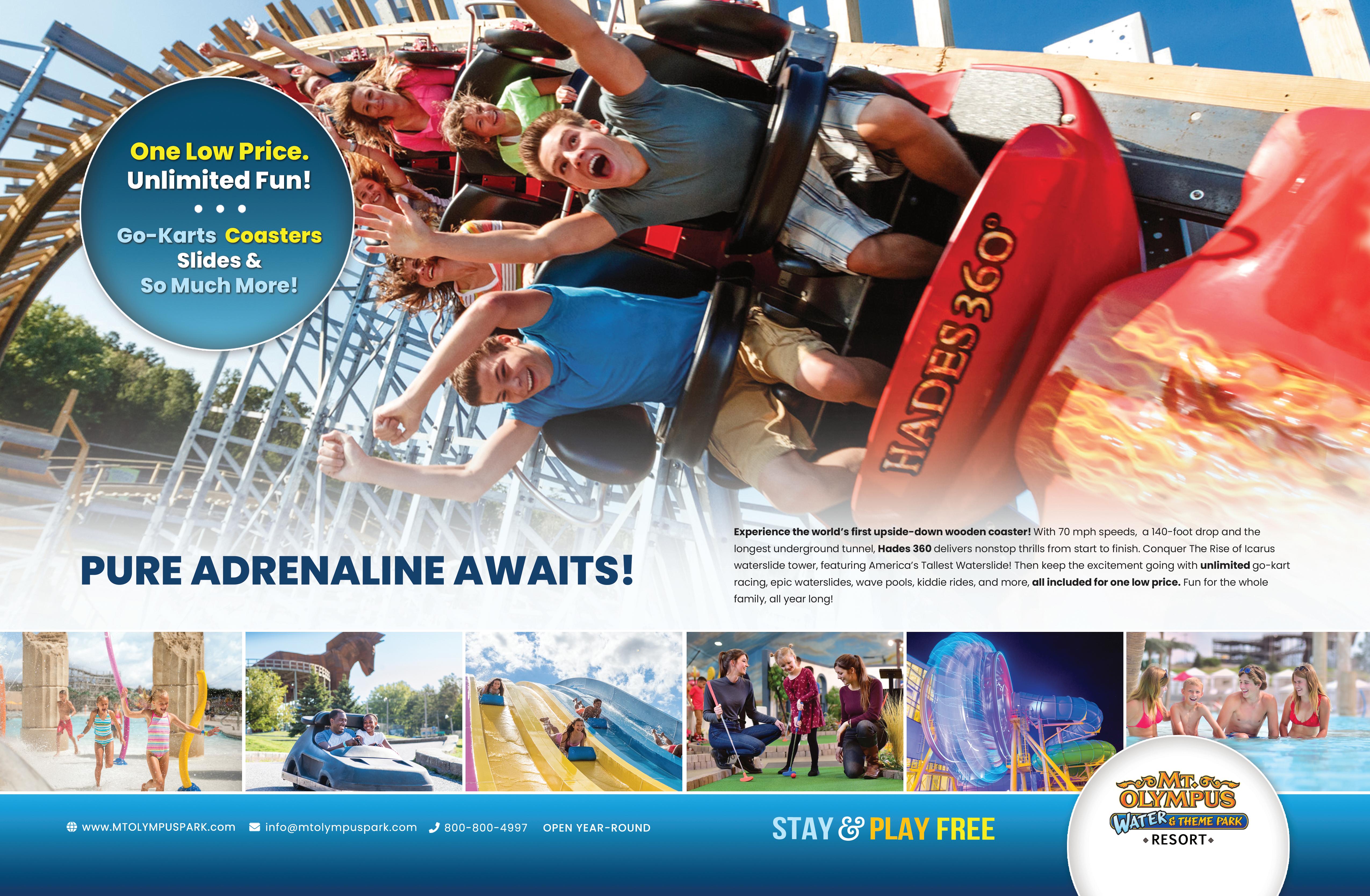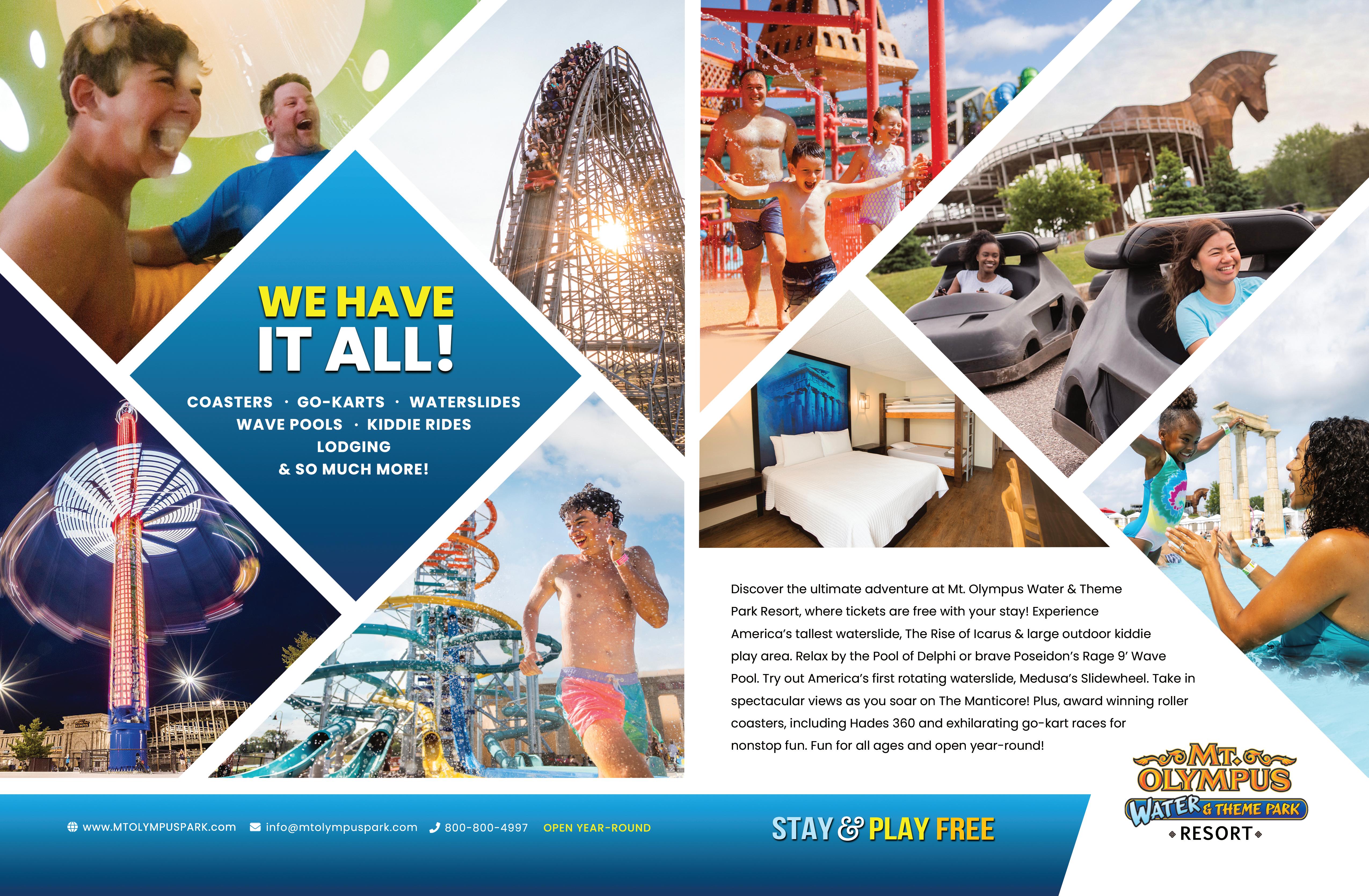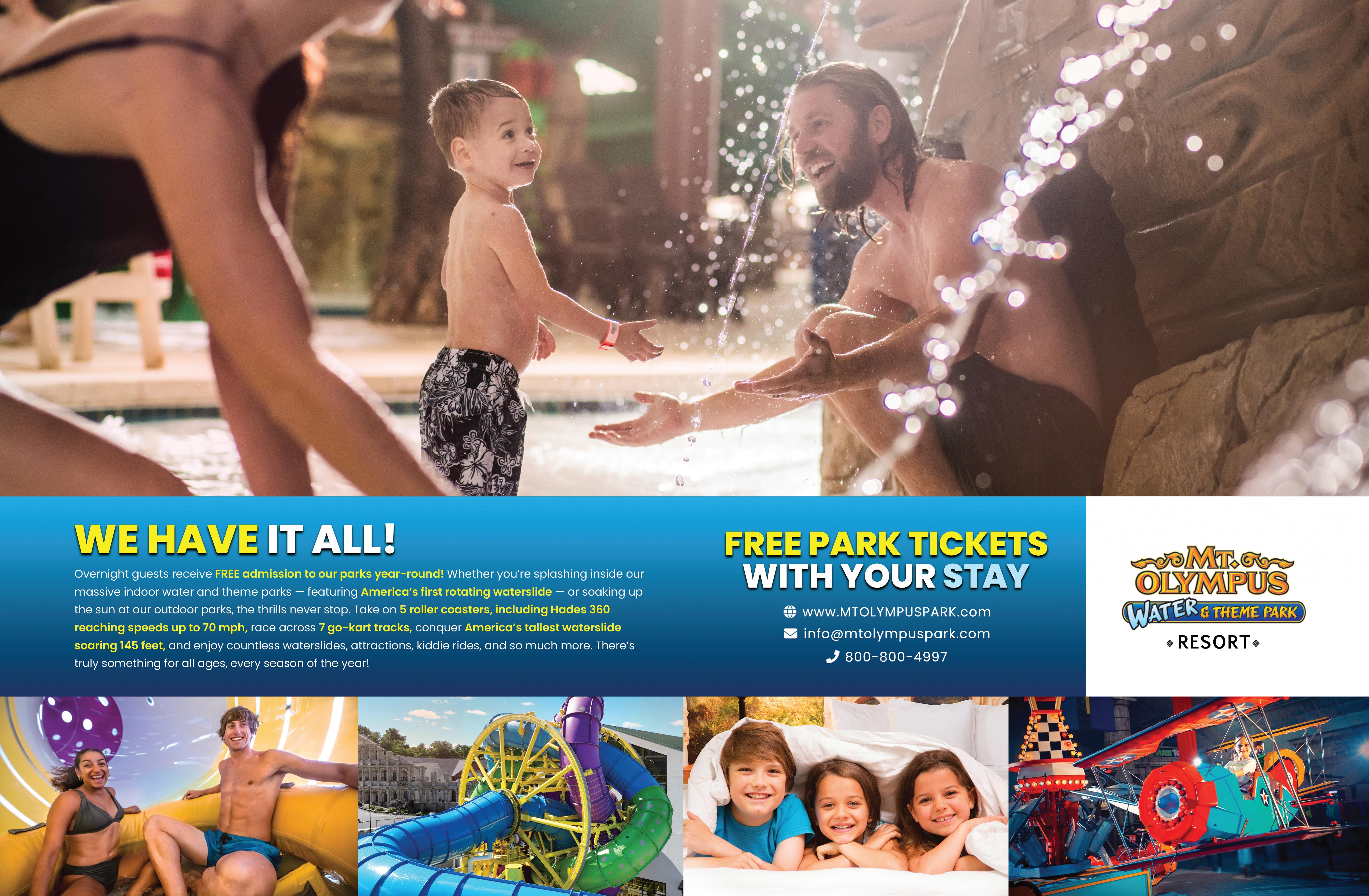Enjoy Medusa’s Slidewheel - America’s first rotating waterslide, along with an indoor water park expansion! Mt. Olympus’ Indoor Water Park has your choice of adventure where you can splash, slide, swim or relax where serenity awaits you.