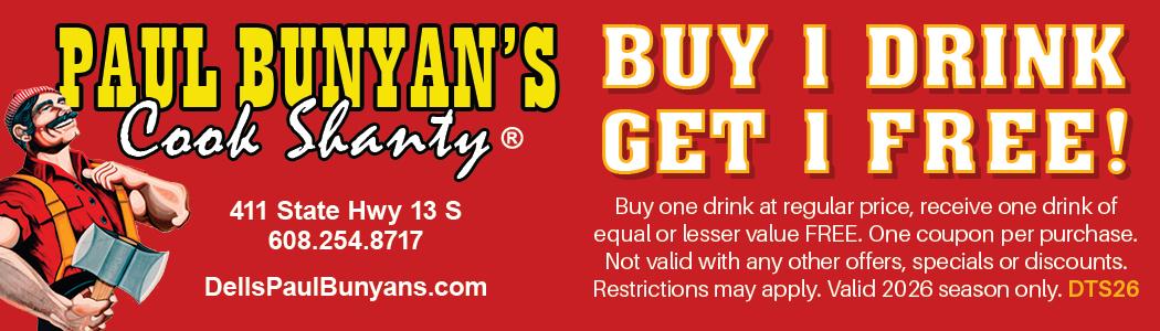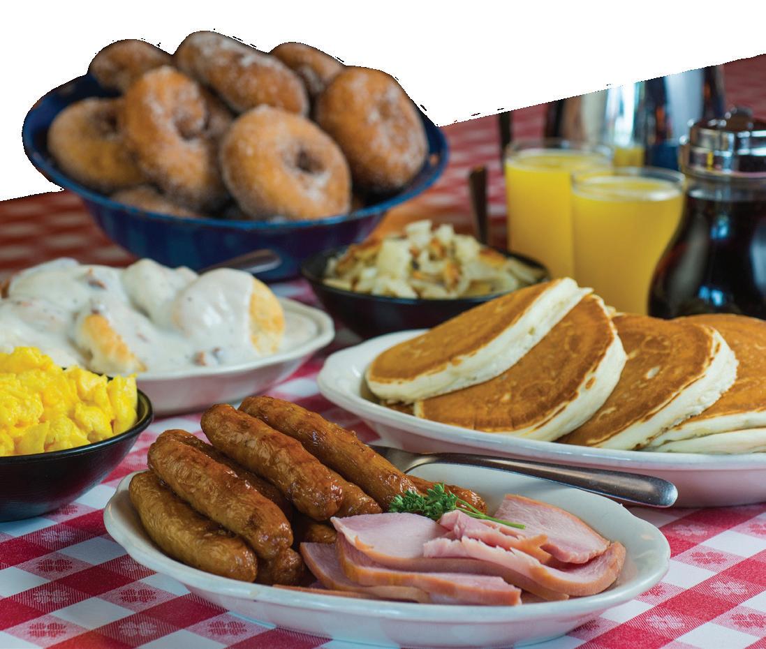 Some Dells mornings call for full “lumberjack mode.” PAUL BUNYAN’S ORIGINAL LOGGING CAMP BREAKFAST comes familystyle with a lineup that hits every craving: buttermilk pancakes, sausage links and ham, scrambled eggs, camp fried potatoes, biscuits & gravy—and world famous homemade buttermilk donuts. Coffee, hot tea, milk, and juice are included, so the table stays moving even when the pancakes don’t. It’s the easy “feed the whole gang at once” move when you want a big start before rides, shows, or park time. Bring an appetite, and let the stacks (and donuts) handle the pep talk.