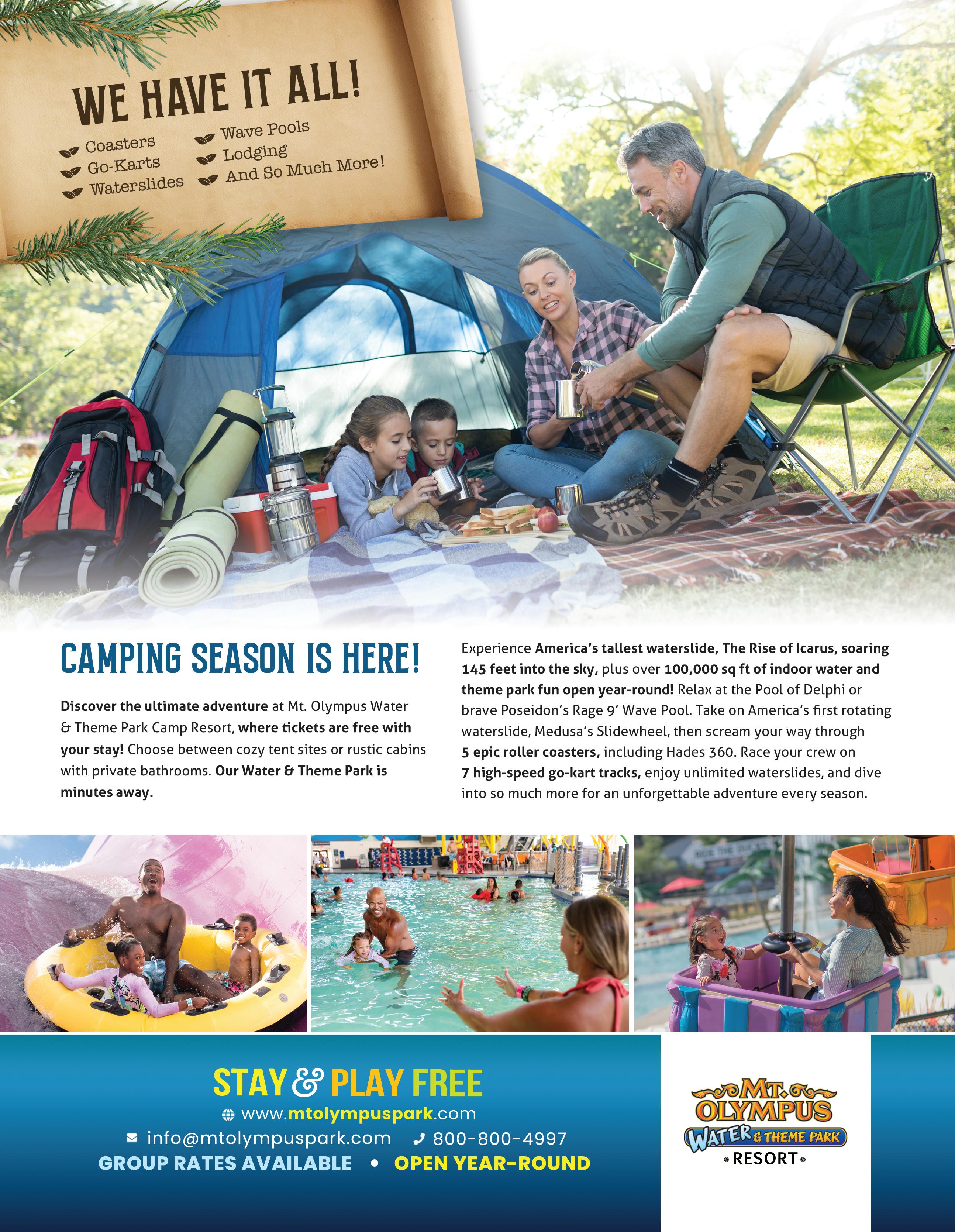 OLYMPUS CAMP RESORT (no playground, no pets) 655 N Frontage Rd, Wis Dells 800-800-4997 | 608-254-8560 mtolympuspark.com See ad page 95