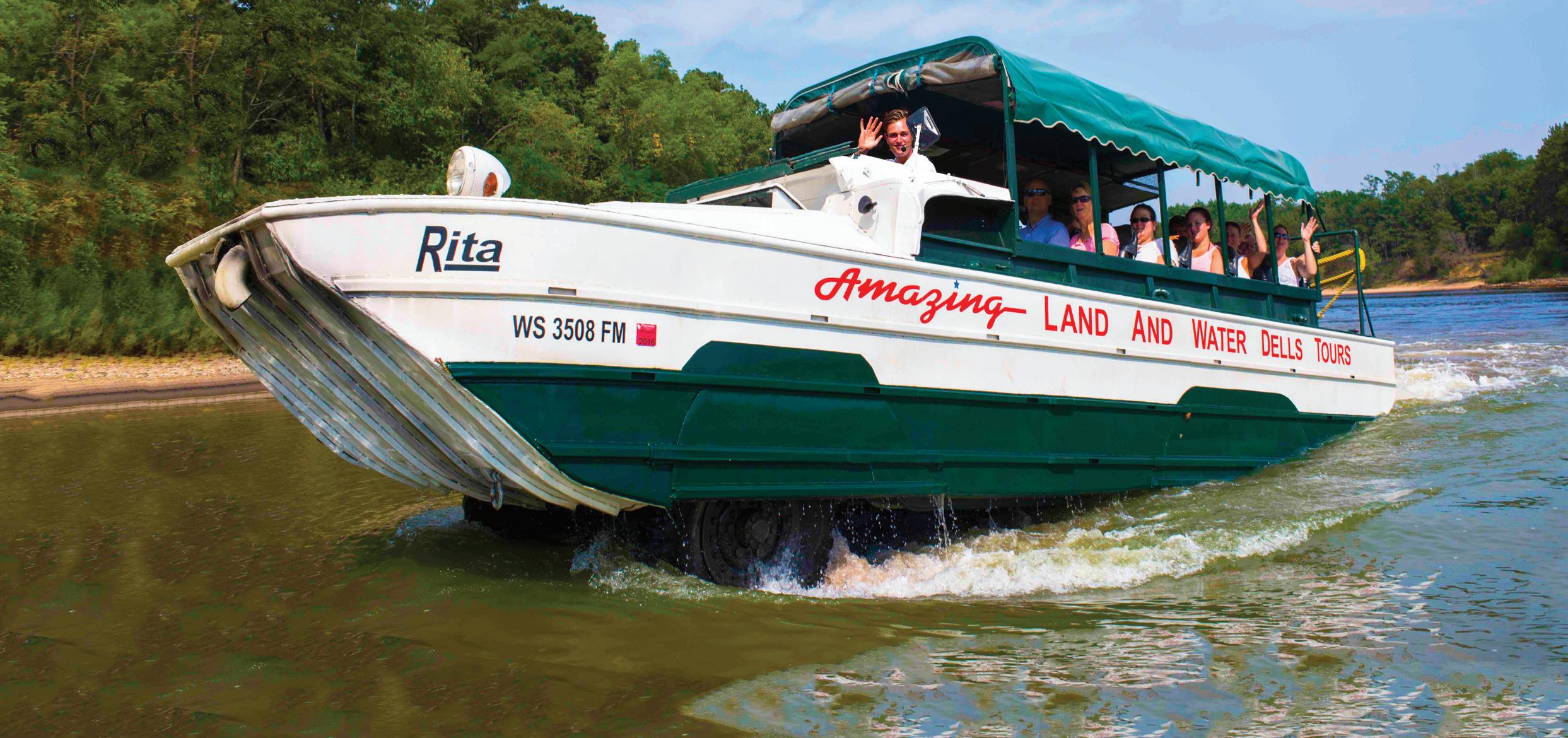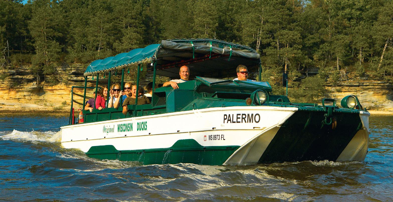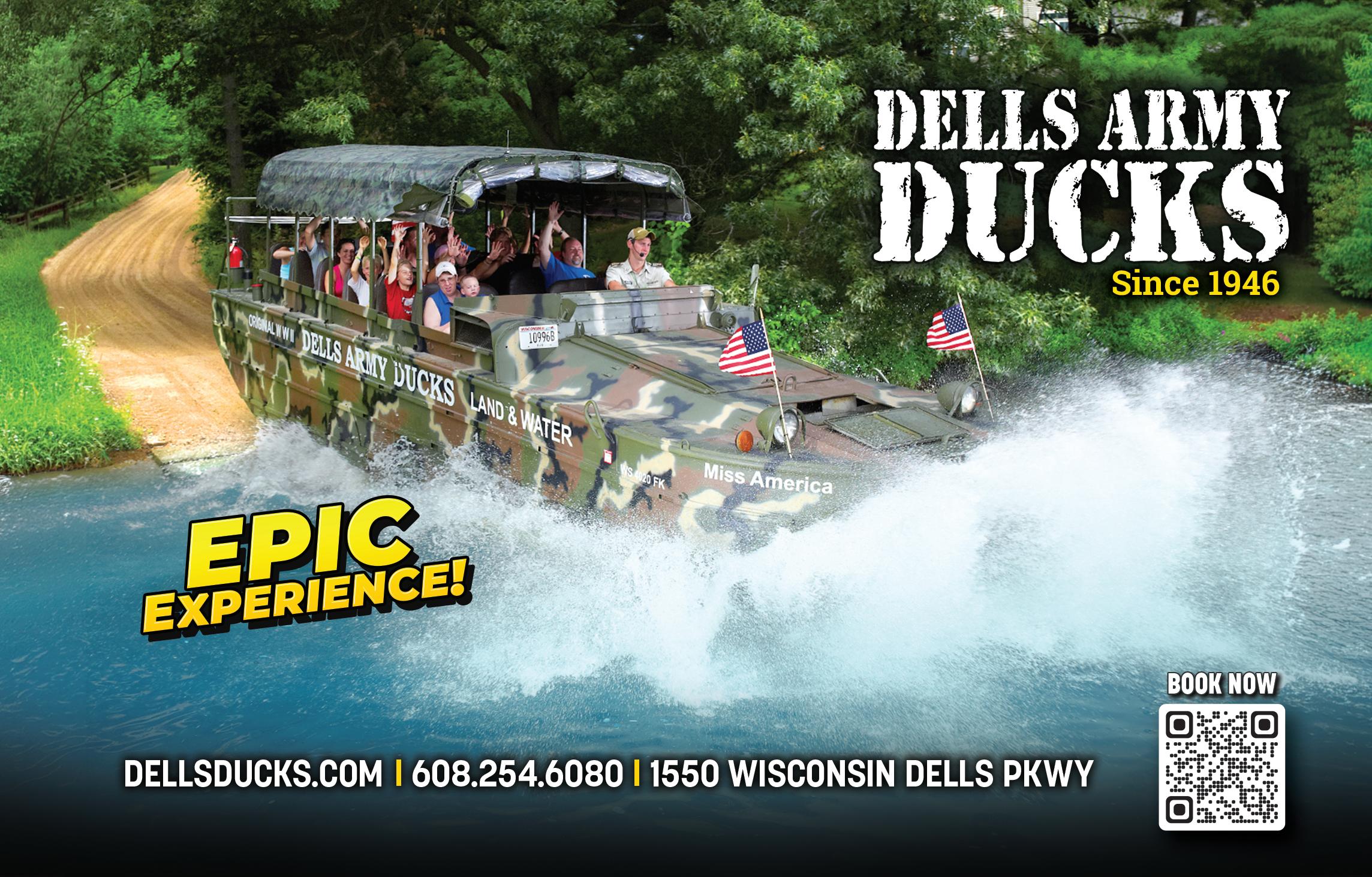 Welcome aboard for our 80th anniversary! Since 1946, Original Wisconsin Ducks has thrilled generations of riders with exciting 1-hour, 8.5-mile amphibious tours — half on land and half on water. Traverse the Wisconsin River, Dell Creek and Lake Delton, then explore miles of exclusive wilderness trails featuring Fern Dell, Roller Coaster Hill and Red Bird Gorge! Open daily mid-Mar thru mid-Nov. 608-254-8751 | wisducks.com