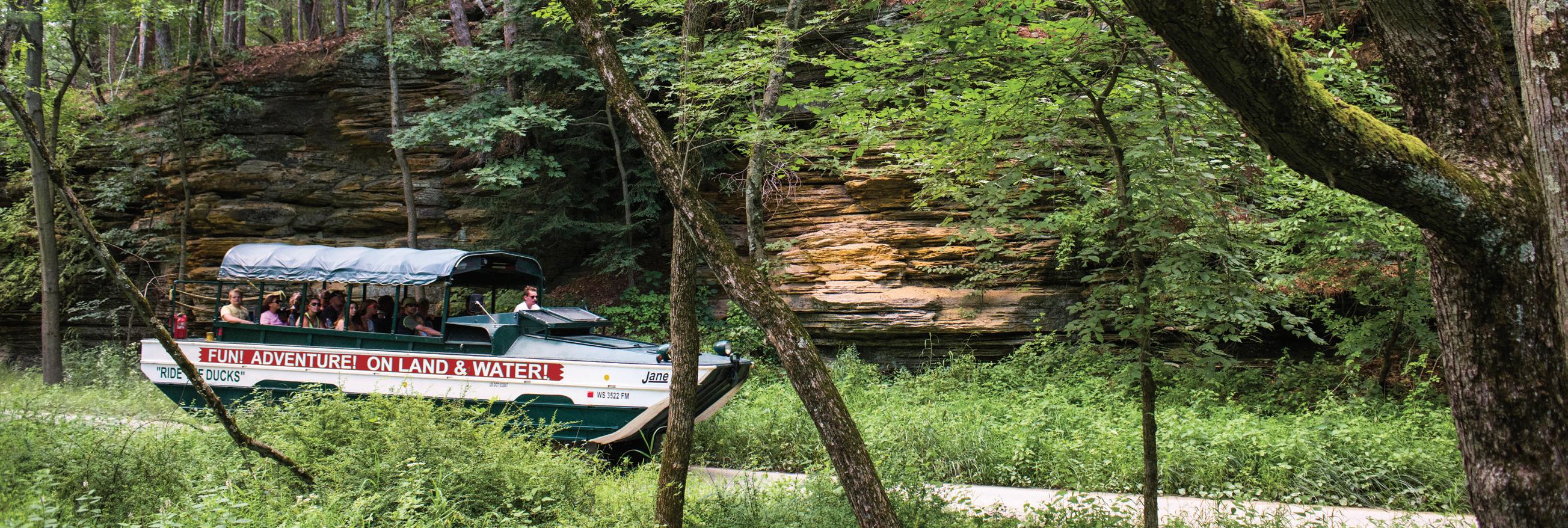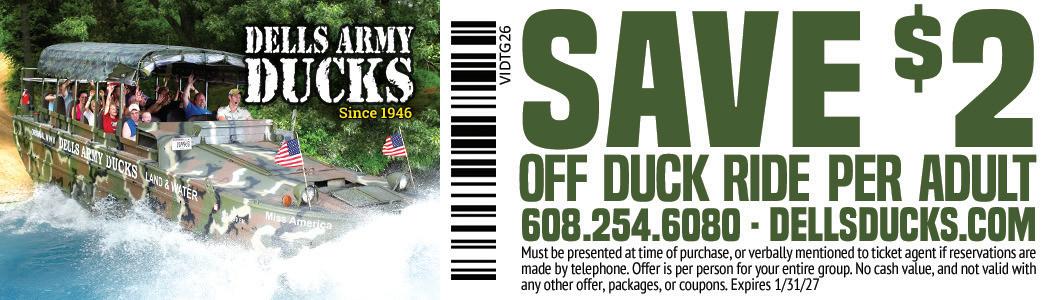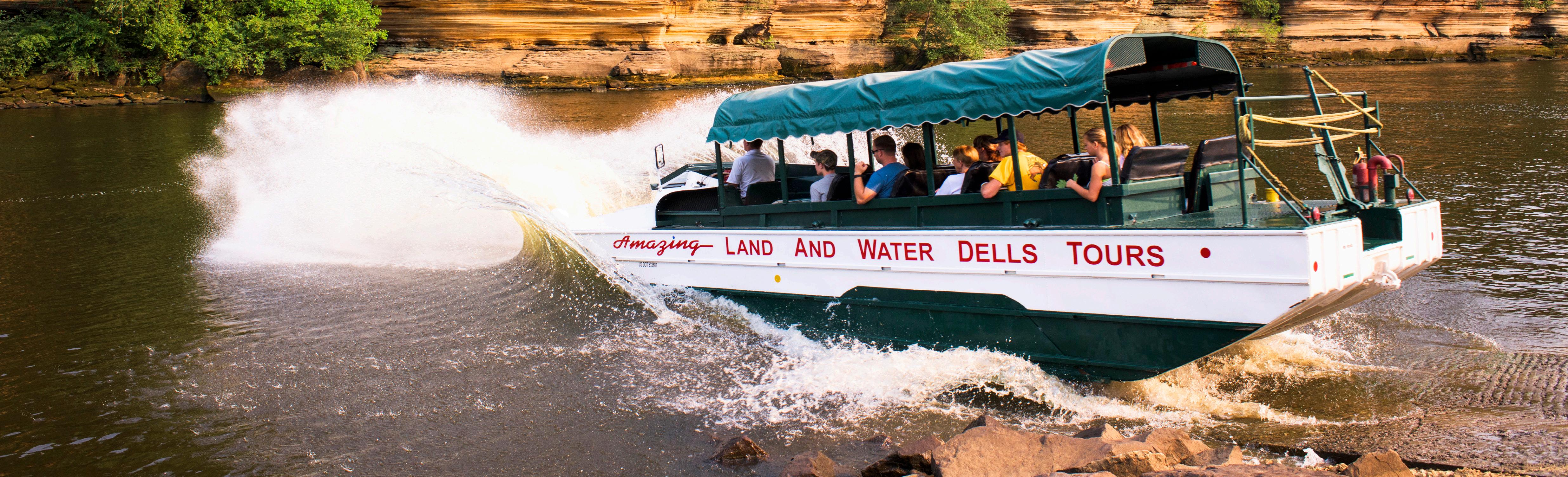 Welcome aboard for our 80th anniversary! Since 1946, Original Wisconsin Ducks has thrilled generations of riders with exciting 1-hour, 8.5-mile amphibious tours — half on land and half on water. Traverse the Wisconsin River, Dell Creek and Lake Delton, then explore miles of exclusive wilderness trails featuring Fern Dell, Roller Coaster Hill and Red Bird Gorge! Open daily mid-Mar thru mid-Nov. 608-254-8751 | wisducks.com