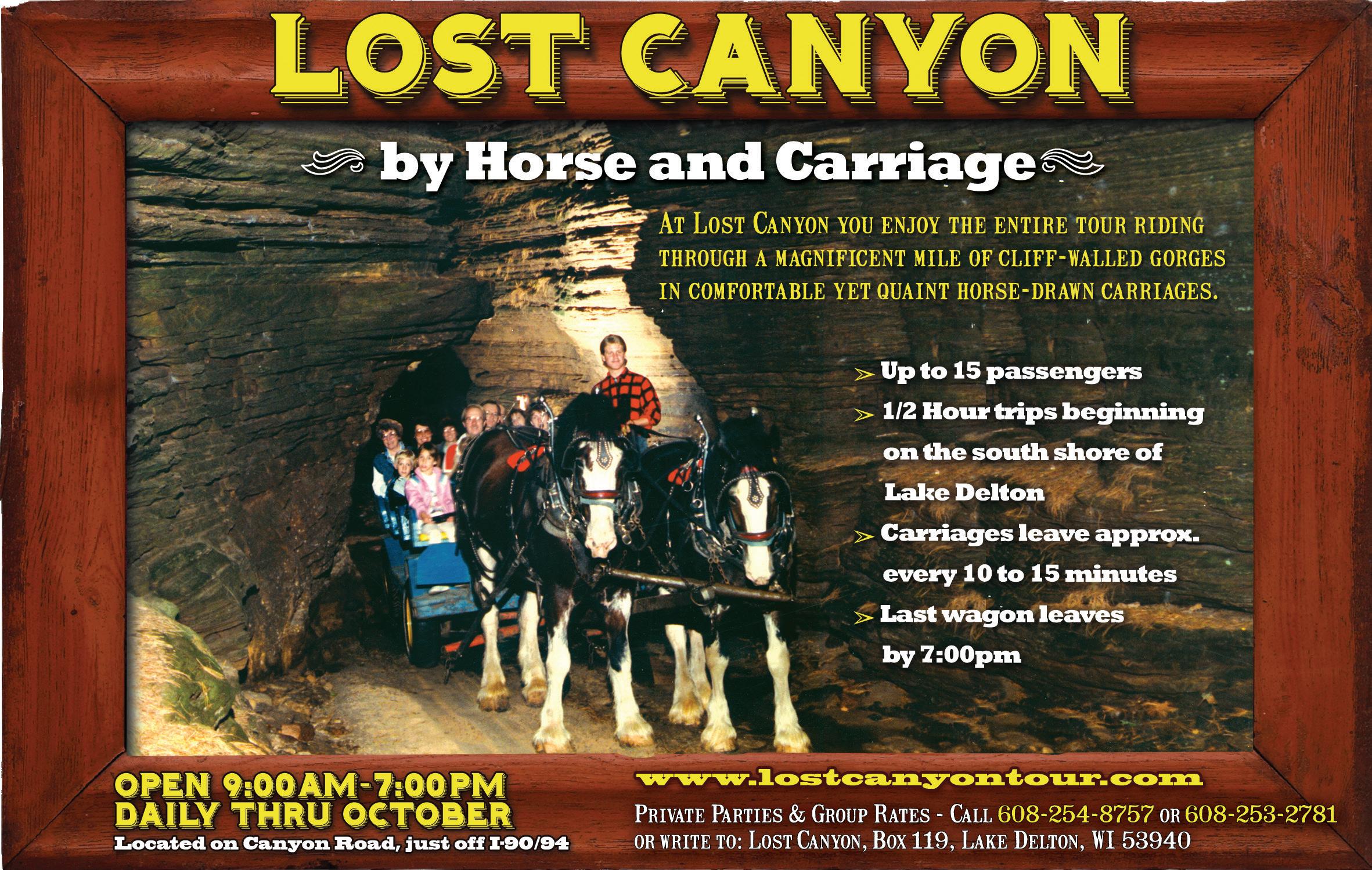 No walking — Dells most enjoyable halfhour horse-drawn carriage tour through a mile of awe and wonder. It’s a must at the Dells — a memorable family experience. Enjoy tranquility and Mother Nature at her best. Open daily April through October.