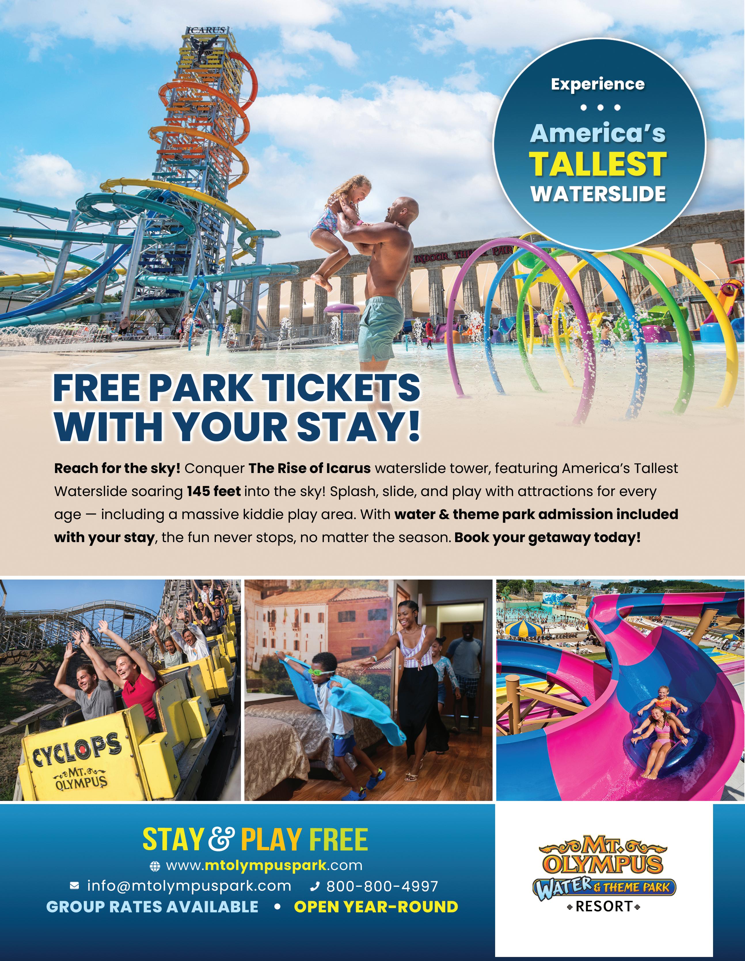 Experience our newest attractionThe Rise of Icarus, America’s Tallest Waterslide! Enjoy Medusa’s Slidewheel - America’s first rotating waterslide, hair-raising coasters, go-kart tracks, countless steep and slippery slides, Poseidon’s Rage 9’ Wave Pool, kiddie play areas and so much more!