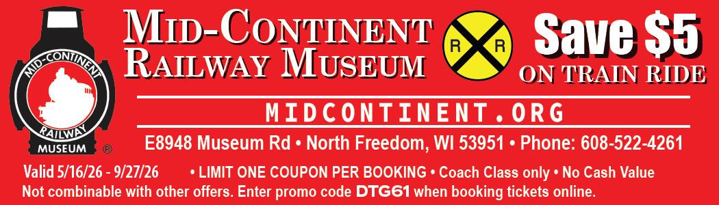 55-minute ride aboard historic train and railroad museum with 40+ restored trains and railroad exhibits on display. Open weekends May 16-Oct. 26 and open weekdays (except Mondays) June 16-Sept. 7. Seasonal special events. See website for full list of departure times and event dates.