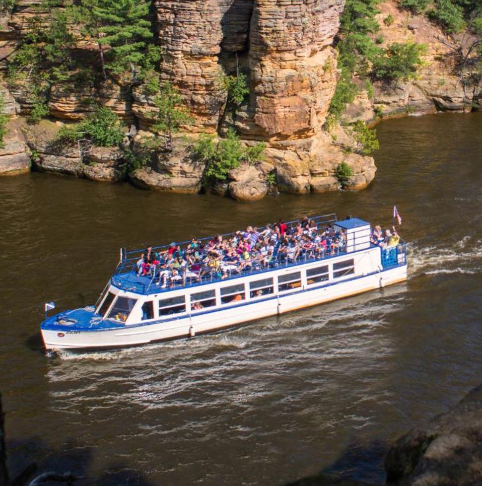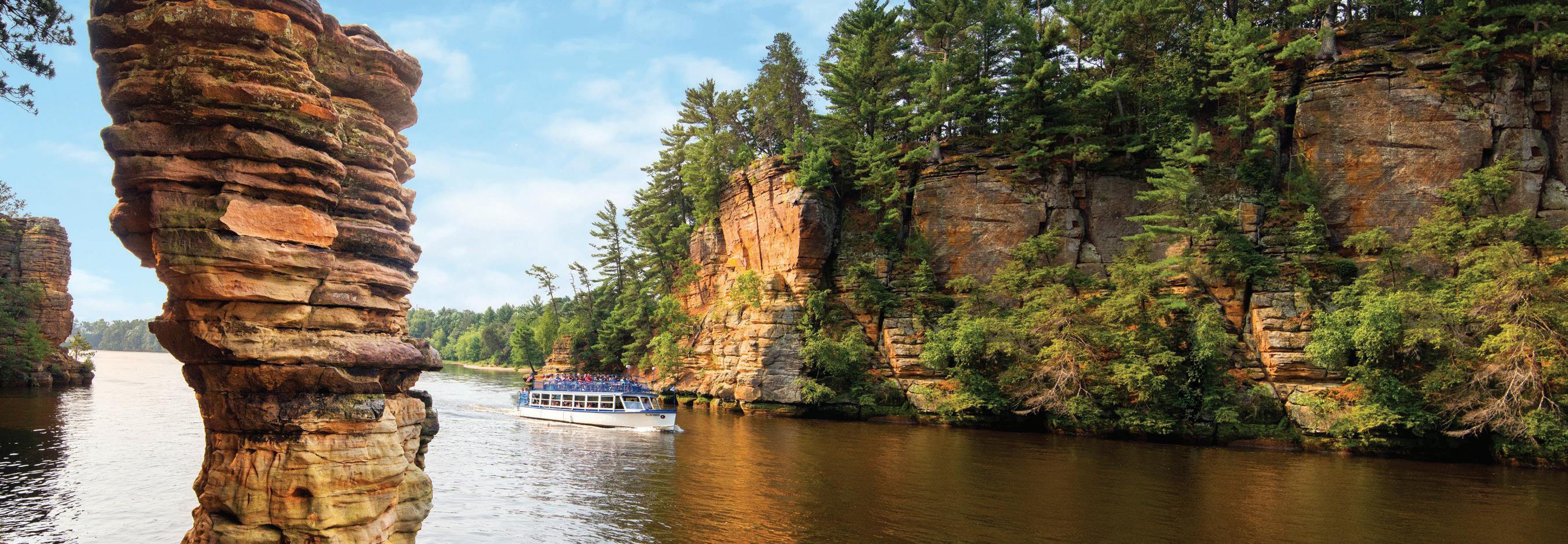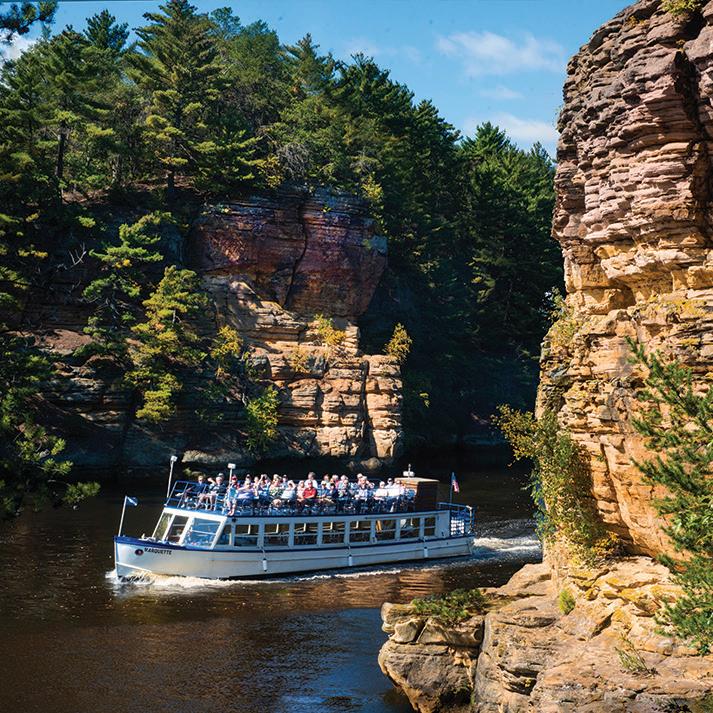 Embark on a scenic adventure through the beautiful Upper Dells of the Wisconsin River! You’ll enjoy 15 miles of spectacular scenic wonders, including awesome rock formations, hidden passages winding deep into the river wilderness, and two exclusive shorelandings at Witches Gulch and Stand Rock, the site of the world-famous dog leap. Open daily Apr. - Oct. 608-254-8555 | dellsboats.com
