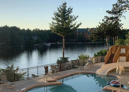 SUNSET BAY RESORT & SUITES is the kind of “best-kept secret”. You can build an entire lake day without leaving the property. Start on their private Lake Delton beach with beach volleyball, and an outdoor splash pad. Then level up with complimentary single or double kayaks and take a shoreline cruise. When you’re ready to swap sand for slides, they have an indoor heated pool with two waterslides, plus a whirlpool and dry sauna. Cap it Dells-style with nightly bonfires year-round and a late-night arcade & rec room rematch. The best option is one of their Lakeview rooms with a private balcony looking over the lake.