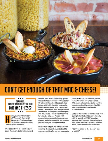 ere you are, in the middle of “America’s Dairyland,” Wisconsin. Producer of over 30% of the country’s cheese. Cheese, glorious cheese. Who doesn’t love cheese? It would be un-American. Better still, mac and