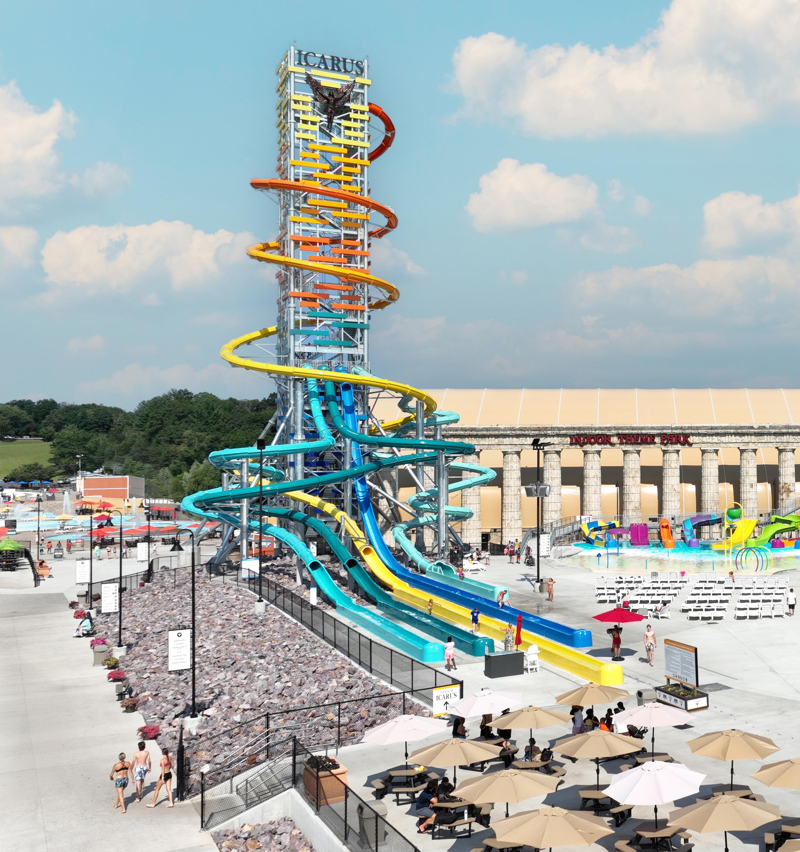 At Mt. Olympus Water & Theme Park Resort, where you Stay & Play All Day Free, the thrills never take a day off—literally. The Rise of Icarus, now officially America’s tallest waterslide, dares you to defy gravity with a plunge from 145 feet up. With four more body slides at 60 feet each, it’s a whole tower of high-speed, splashy fun. Kiddos will beeline to the Icaria Splash ‘n Slide, a kid-friendly water feature including 10 featured slides!