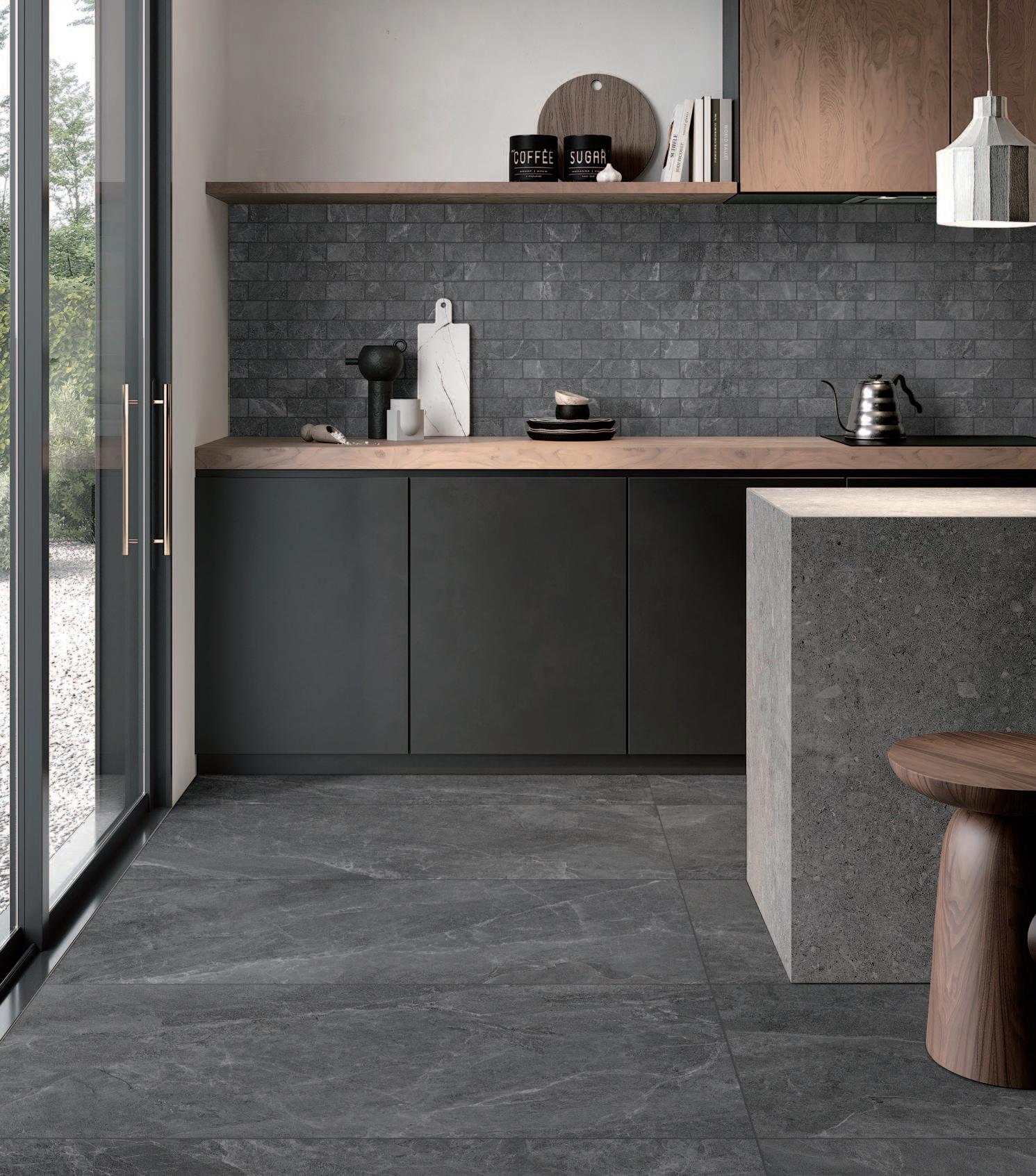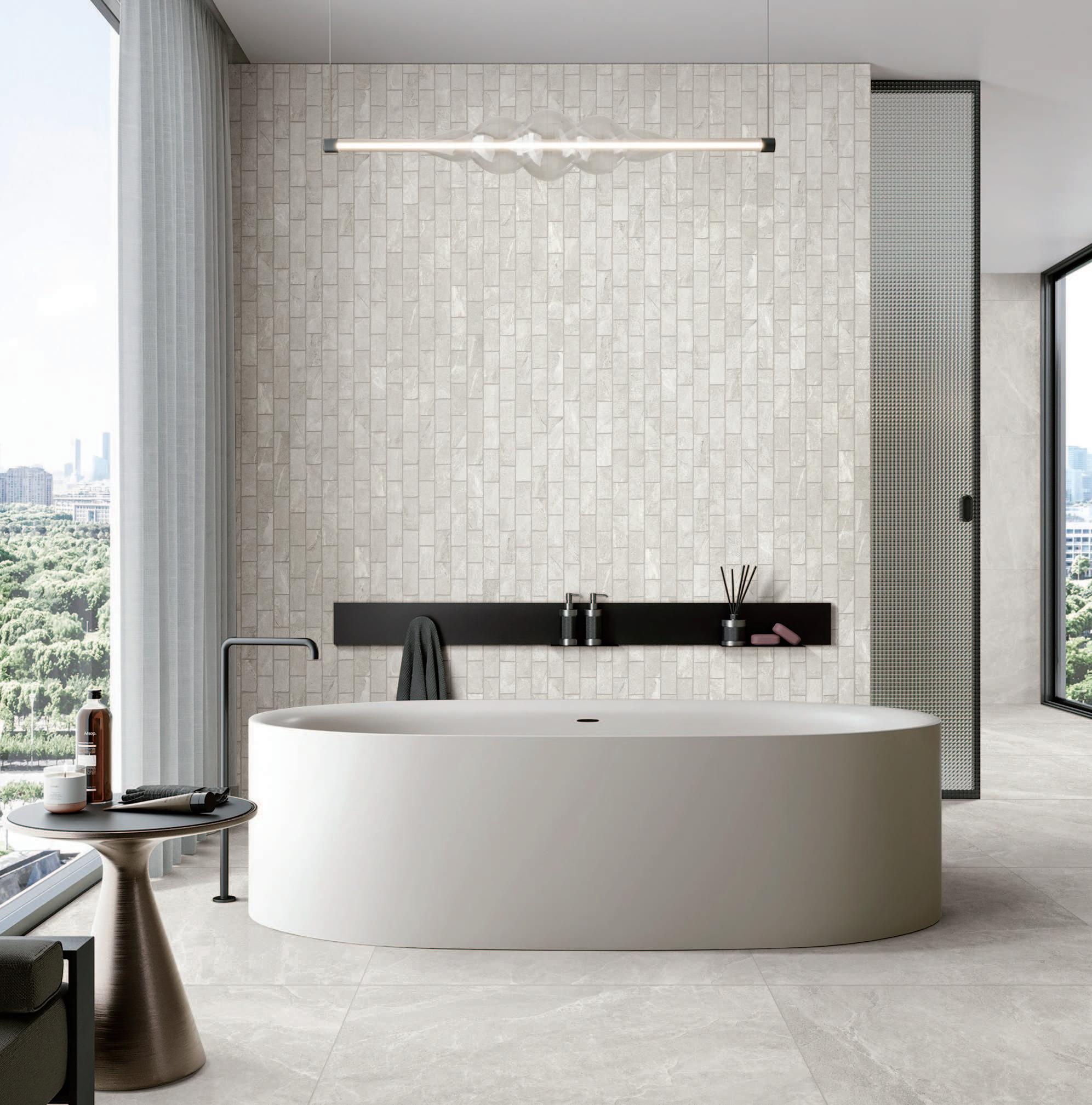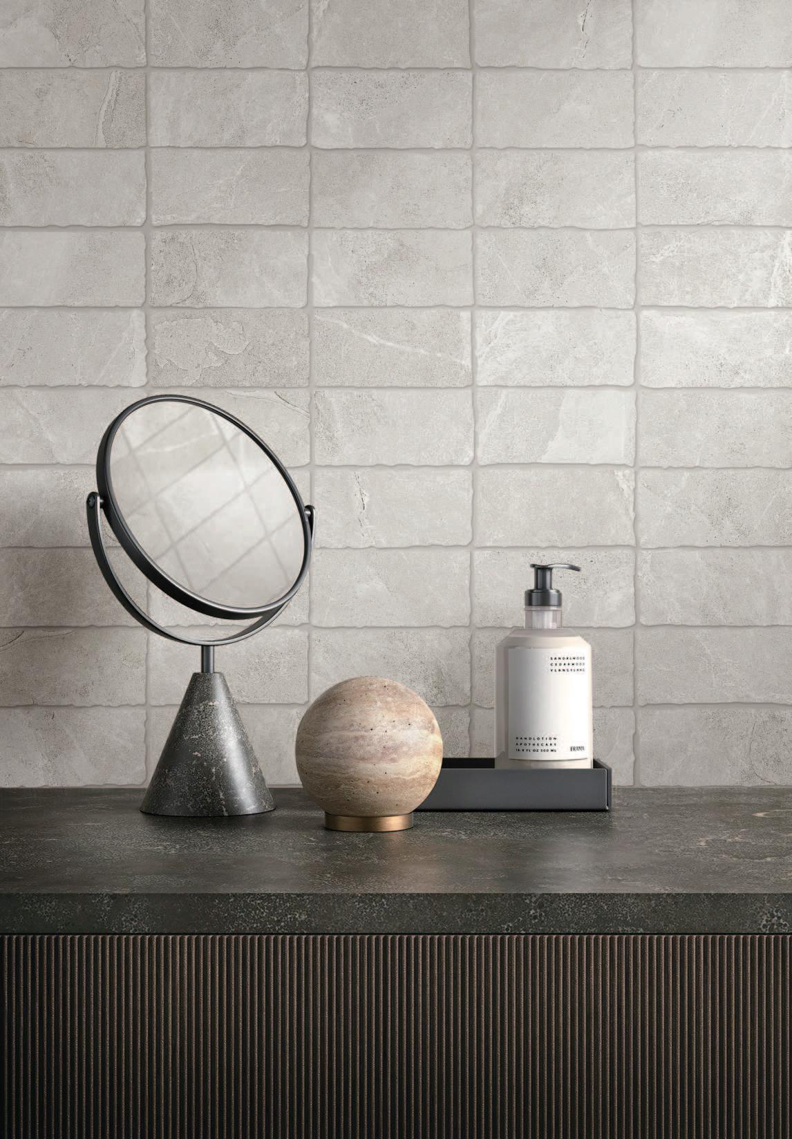 FLOOR : PEPPER 60 x 120CM WALL : TUMBLED EDGE MOSAIC 29.8 x 32.7CM