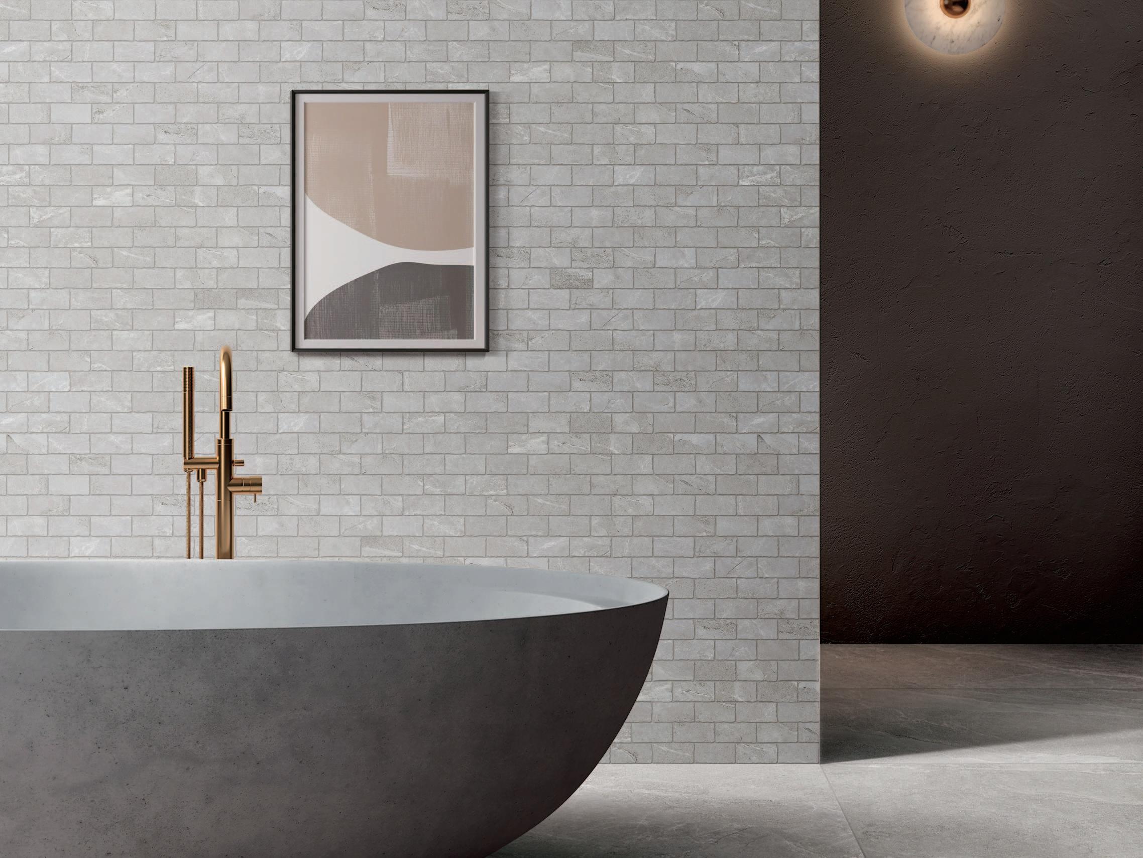 FLOOR : EARL GREY 60 x 120CM WALL : TUMBLED EDGE MOSAIC 29.8 x 32.7CM FLOOR : EARL GREY 60 x 60CM
