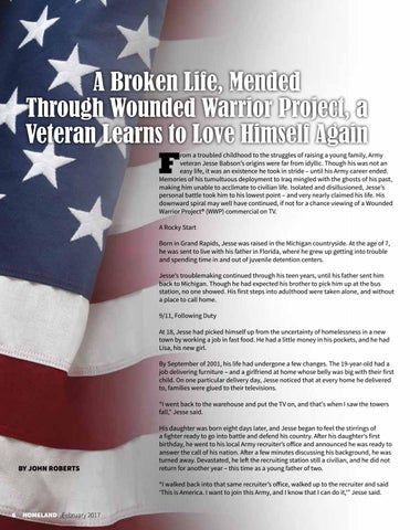 rom a troubled childhood to the struggles of raising a young family, Army veteran Jesse Babson’s origins were far from idyllic. Though his was not an easy life, it was an existence he took in stride – until his Army career ended. Memories of his tumultuous deployment to Iraq mingled with the ghosts of his past, making him unable to acclimate to civilian life. Isolated and disillusioned, Jesse’s personal battle took him to his lowest point – and very nearly claimed his life. His downward spiral may well have continued, if not for a chance viewing of a Wounded Warrior Project® (WWP) commercial on TV. A Rocky Start Born in Grand Rapids, Jesse was raised in the Michigan countryside. At the age of 7, he was sent to live with his father in Florida, where he grew up getting into trouble and spending time in and out of juvenile detention centers. Jesse’s troublemaking continued through his teen years, until his father sent him back to Michigan. Though he had expected his brother to pick him up at the bus station, no one showed. His first steps into adulthood were taken alone, and without a place to call home. 9/11, Following Duty At 18, Jesse had picked himself up from the uncertainty of homelessness in a new town by working a job in fast food. He had a little money in his pockets, and he had Lisa, his new girl. By September of 2001, his life had undergone a few changes. The 19-year-old had a job delivering furniture – and a girlfriend at home whose belly was big with their first child. On one particular delivery day, Jesse noticed that at every home he delivered to, families were glued to their televisions. “I went back to the warehouse and put the TV on, and that’s when I saw the towers fall,” Jesse said.
