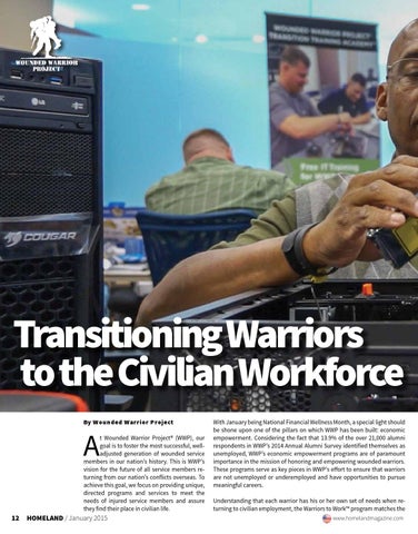 With January being National Financial Wellness Month, a special light should be shone upon one of the pillars on which WWP has been built: economic empowerment. Considering the fact that 13.9% of the over 21,000 alumni respondents in WWP’s 2014 Annual Alumni Survey identified themselves as unemployed, WWP’s economic empowerment programs are of paramount importance in the mission of honoring and empowering wounded warriors. These programs serve as key pieces in WWP’s effort to ensure that warriors are not unemployed or underemployed and have opportunities to pursue meaningful careers. Understanding that each warrior has his or her own set of needs when returning to civilian employment, the Warriors to Work™ program matches the www.homelandmagazine.com