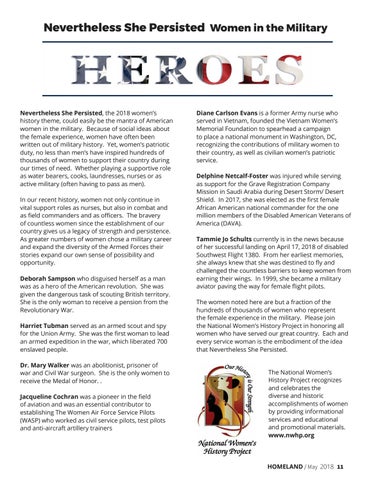 Diane Carlson Evans is a former Army nurse who served in Vietnam, founded the Vietnam Women’s Memorial Foundation to spearhead a campaign to place a national monument in Washington, DC, recognizing the contributions of military women to their country, as well as civilian women’s patriotic service. Delphine Netcalf-Foster was injured while serving as support for the Grave Registration Company Mission in Saudi Arabia during Desert Storm/ Desert Shield. In 2017, she was elected as the first female African American national commander for the one million members of the Disabled American Veterans of America (DAVA). Tammie Jo Schults currently is in the news because of her successful landing on April 17, 2018 of disabled Southwest Flight 1380. From her earliest memories, she always knew that she was destined to fly and challenged the countless barriers to keep women from earning their wings. In 1999, she became a military aviator paving the way for female flight pilots. The women noted here are but a fraction of the hundreds of thousands of women who represent the female experience in the military. Please join the National Women’s History Project in honoring all women who have served our great country. Each and every service woman is the embodiment of the idea that Nevertheless She Persisted.