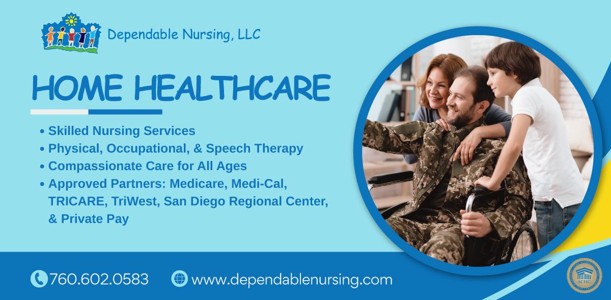 For over 20 years Dependable Nursing has been serving the San Diego, Riverside and Orange counties with inhome skilled nursing care and therapies. As a Medicare and Medi-Cal certified home health agency and an approved Tricare and TriWest provider, Dependable Nursing brings together skilled nursing, physical therapy, occupational therapy, and speech therapy to help veterans and military families regain their strength and independence after hospital stays or surgical procedures.
