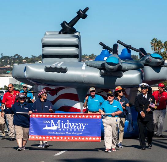 The annual parade, under the leadership of the USS Midway Museum, features more than 80 enthusiastic participants including a variety of bands, floats, ceremonial vehicles and marching units from veterans organizations, military commands, local businesses, and community service and civic groups.