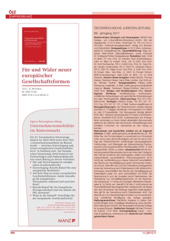 66. Jahrgang 2011 Medieninhaber (Verleger) und Herausgeber: MANZ'sche Verlags- und Universitätsbuchhandlung GmbH. Sitz der Gesellschaft: A-1014 Wien, Kohlmarkt 16, FN 124 181 w, HG Wien. Unternehmensgegenstand: Verlag von Büchern und Zeitschriften. Verlagsadresse: A-1015 Wien, Johannesgasse 23 (verlag@manz.at). Geschäftsführung: Mag. Susanne Stein-Dichtl (Geschäftsführerin) sowie Prokurist Dr. Wolfgang Pichler (Verlagsleitung). Redaktion: Sekt.-Chef im BMJ i. R. Hon.-Prof. Dr. Gerhard Hopf (Chefredakteur), LStA im BMJ Dr. Robert Fucik, HR d. OGH Hon.-Prof. Dr. Kurt Kirchbacher, HR d. VwGH Hon.-Prof. Dr. Hans Peter Lehofer; Evidenzblatt: HR d. OGH Dr. Christoph Brenn, HR d. OGH Dr. Helge Hoch, Vize-Präs. d. OGH Hon.-Prof. Dr. Eckart Ratz, Vize-Präs. d. OGH Dr. Ronald Rohrer; MRK-Entscheidungen: Sekt.-Chef im BKA i. R. Dr. Wolf Okresek. Autoren dieser Ausgabe: Walter Barfuß, Thomas Garber, Reinhard Hinger, Hans Peter Lehofer, Kurt Schmoller, Michael Taufner. Verlagsredaktion: MMag. Judith Gerngross-Langthaler, E-Mail: judith.gerngross-langthaler@ manz.at Druck: Ferdinand Berger & Söhne Ges.m.b.H., 3580 Horn. Verlags- und Herstellungsort: Wien. Grundlegende Richtung: Veröffentlichung rechtswissenschaftlicher Abhandlungen und gerichtlicher Entscheidungen aus allen Rechtsgebieten. Zitiervorschlag: ÖJZ 2011/Artikelnummer. Anzeigen: Heidrun Engel, Tel: (01) 531 61310, Fax: (01) 531 61-181, E-Mail: heidrun.engel@manz.at Bezugsbedingungen: Die Österreichische Juristen-Zeitung erscheint in 14-tägigen Abständen mit insgesamt 24 Heften im Jahr (2 Doppelhefte). Der Bezugspreis beträgt jährlich EUR 396,– inklusive Versandspesen im Inland und Einbanddecke. Einzelheft EUR 20,60. Auslandspreise auf Anfrage. Nicht rechtzeitig vor ihrem Ablauf abbestellte Abonnements gelten für ein weiteres Jahr als erneuert. Abbestellungen sind schriftlich 6 Wochen vor Jahresende an den Verlag zu senden. Manuskripte und Zuschriften erbitten wir an folgende Adresse: E-Mail: judith.gerngross-langthaler@manz.at. Wir bitten Sie, die Formatvorlagen zu verwenden (zum Download unter www.manz.at/formatvorlagen) und sich an die im Auftrag des Österreichischen Juristentages herausgegebenen „Abkürzungs- und Zitierregeln der österreichischen Rechtssprache und europarechtlicher Rechtsquellen (AZR)“, 6. Aufl (Verlag MANZ, 2008), zu halten. Urheberrechte: Mit der Einreichung seines Manuskriptes räumt der Autor dem Verlag für den Fall der Annahme das übertragbare, zeitlich und örtlich unbeschränkte ausschließliche Werknutzungsrecht (§ 24 UrhG) der Veröffentlichung in dieser Zeitschrift, einschließlich des Rechts der Vervielfältigung in jedem technischen Verfahren (Druck, Mikrofilm etc) und der Verbreitung (Verlagsrecht) sowie der Verwertung durch Datenbanken oder ähnliche Einrichtungen, einschließlich des Rechts der Vervielfältigung auf Datenträgern jeder Art, auch einschließlich CD-ROM, der Speicherung in und der Ausgabe durch Datenbanken, der Verbreitung von Vervielfältigungsstücken an die Benutzer, der Sendung (§ 17 UrhG) und sonstigen öffentlichen Wiedergabe (§ 18 UrhG), ein. Gemäß § 36 Abs 2 UrhG erlischt die Ausschließlichkeit des eingeräumten Verlagsrechts mit Ablauf des dem Erscheinen des Beitrags folgenden Kalenderjahrs; dies gilt für die Verwertung durch Datenbanken nicht. Der Nachdruck von Entscheidungen ist daher nur mit ausdrücklicher schriftlicher Bewilligung des Verlags gestattet. Haftungsausschluss: Sämtliche Angaben in dieser Zeitschrift erfolgen trotz sorgfältiger Bearbeitung ohne Gewähr. Eine Haftung der Autoren, der Herausgeber sowie des Verlags ist ausgeschlossen. Grafisches Konzept: Michael Fürnsinn für buero8, 1070 Wien. Covergestaltung: bauer – konzept & gestaltung, erwinbauer.com Gedruckt auf chlorfrei gebleichtem Papier.