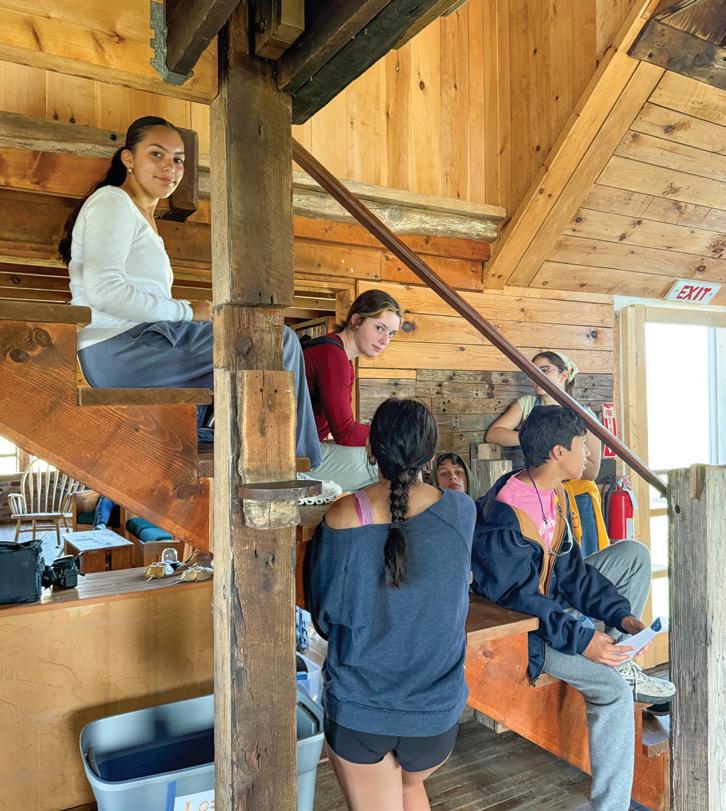 Below: Ninth-grade students look for birds while exploring Penikese Island. Bottom (left to right): A wide view of the historic structures on Penikese Island; Alanna Andrews ’29 and her classmates take part in group activities; Students explore the island’s trails.