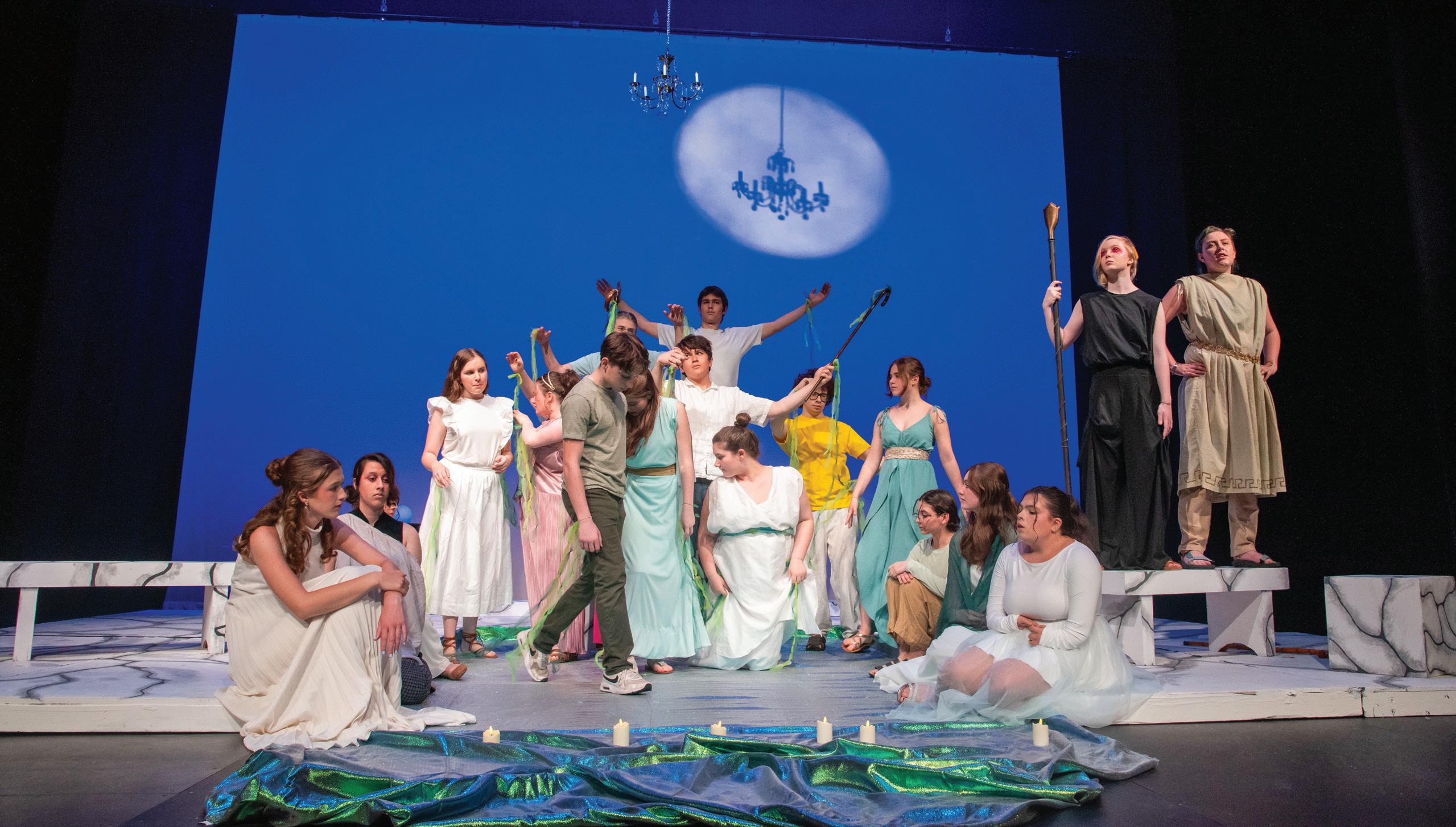 In May, Falmouth Academy students performed Metamorphoses by Mary Zimmerman. Adapted from Ovid’s classic poem, the play explores timeless Greek and Roman myths of love, transformation, and loss. The story was set around a shimmering pool that served as both stage and symbol. Through a series of engaging vignettes, students delivered dynamic performances that showcased both their talent and teamwork, while the creativity of the tech crew shone through a set design that added depth and atmosphere to every scene.