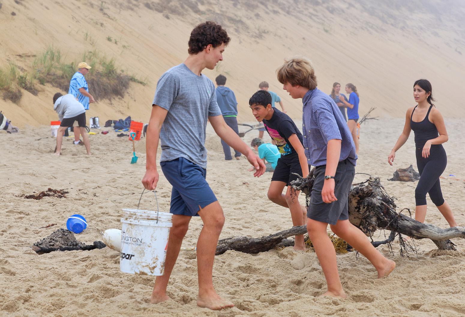 Clockwise from above: Nina Teles ’31, Kate Kalkanis ’30, Beckham Peterson ’30 mix sand for their sculpture; Students build their manatee as part of the “Save Science” group; Lila Mele ’26 preps sand for her team; Alden Bank ’29 carries a bucket as Cruz Cancellare ’31, Kai Aretxabaleta ’30, and Sia Canelos ’26 follow with driftwood; FA staff John Dooley and Sarah Knowles help teammates build their sculpture; Weetamo Pocknett ’31 carries seaweed to her group’s sculpture.
